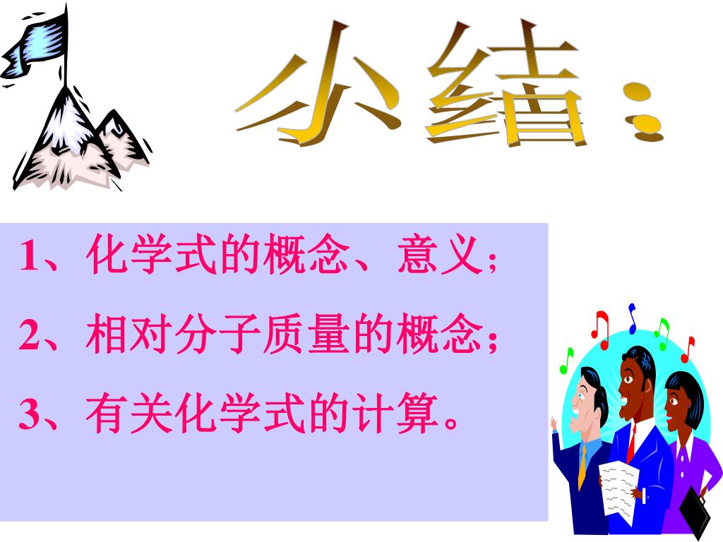 小结: 1、化学式的概念、意义; 2、相对分子质量的概念; 3、有关化学式的计算。