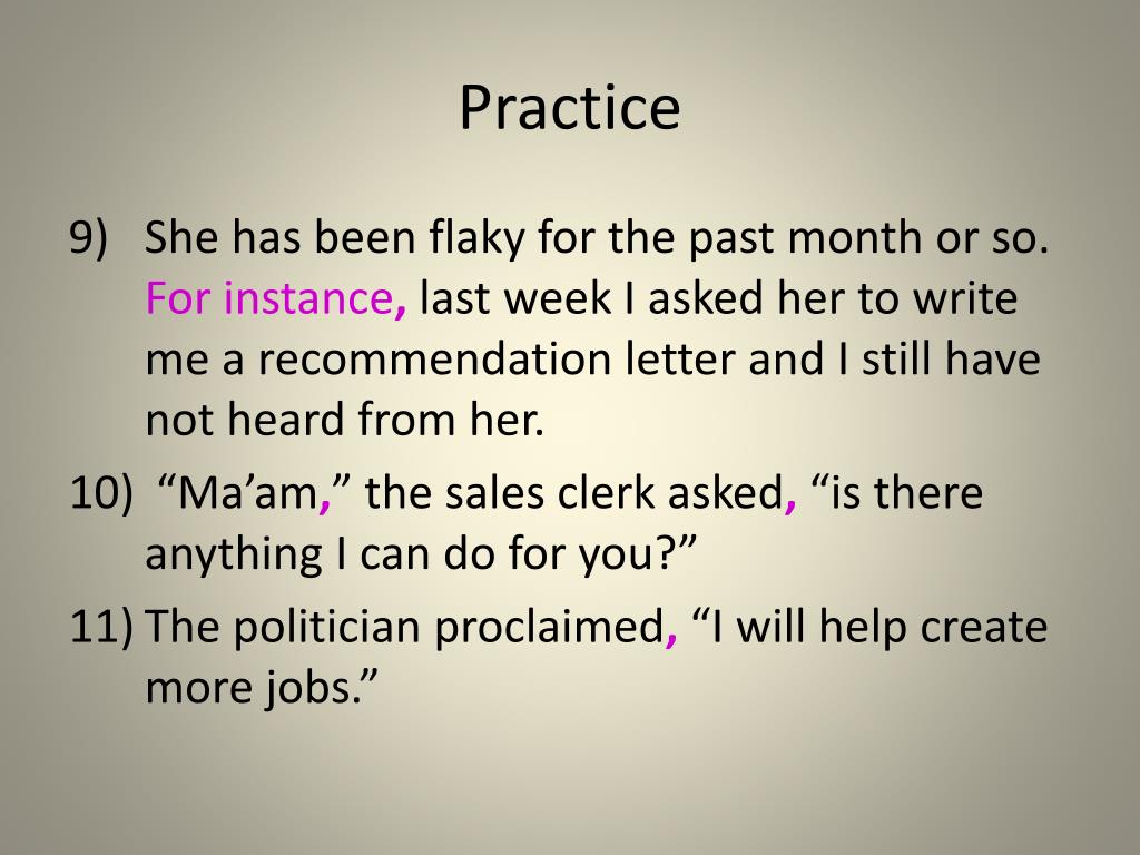 Practice • She has been flaky for the past month or so. For instance, last week I asked her to write me a recommendation letter and I still have not heard from her. • “Ma’am,” the sales clerk asked, “is there anything I can do for you?” • The politician proclaimed, “I will help create more jobs.”