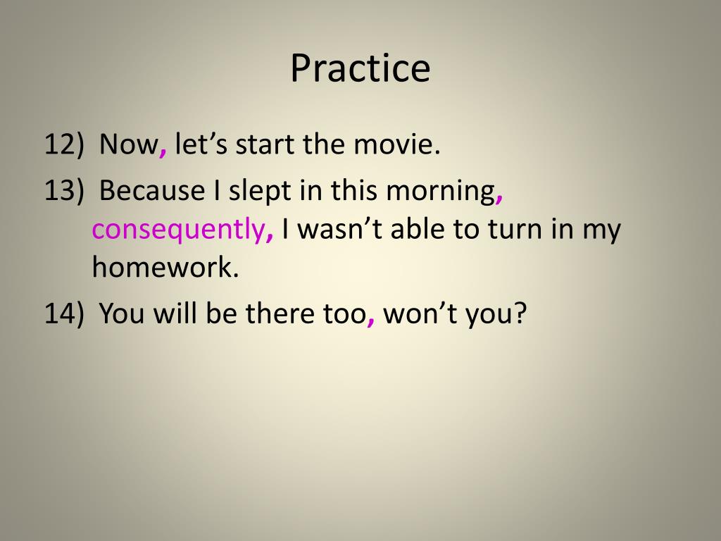 Practice • Now, let’s start the movie. • Because I slept in this morning,consequently, I wasn’t able to turn in my homework. • You will be there too, won’t you?