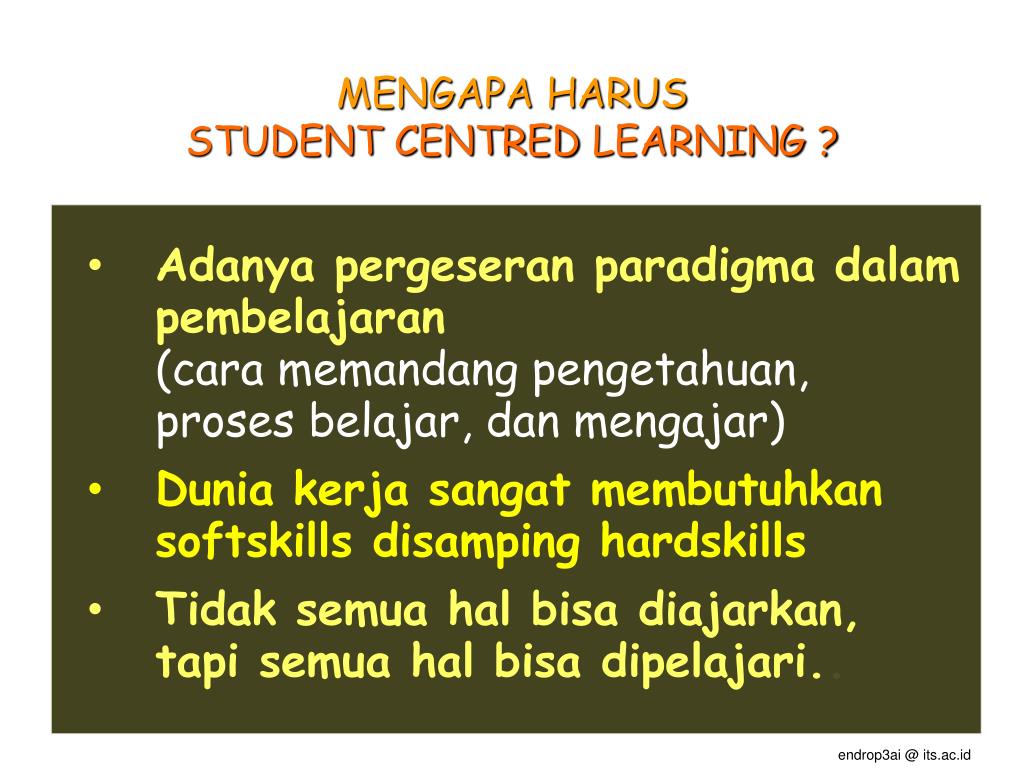 MENGAPA HARUS STUDENT CENTRED LEARNING ? • Adanya pergeseran paradigma dalam pembelajaran (cara memandang pengetahuan, proses belajar, dan mengajar) • Dunia kerja sangat membutuhkan softskills disamping hardskills • Tidak semua hal bisa diajarkan, tapi semua hal bisa dipelajari.. endrop3ai @ its.ac.id