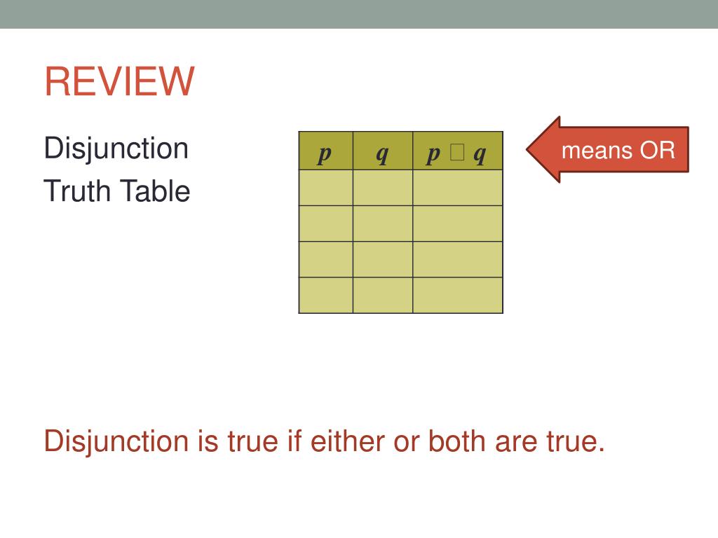 REVIEW means OR Disjunction Truth Table Disjunction is true if either or both are true.