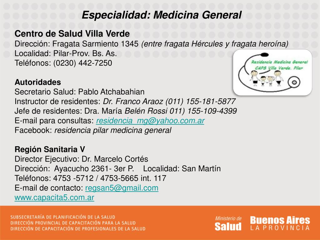 Especialidad: Medicina General Centro de Salud Villa VerdeDirección: Fragata Sarmiento 1345 (entre fragata Hércules y fragata heroína) Localidad: Pilar-Prov. Bs. As. Teléfonos: (0230) 442-7250 AutoridadesSecretario Salud: Pablo AtchabahianInstructor de residentes: Dr. Franco Araoz (011) 155-181-5877 Jefe de residentes: Dra. María Belén Rossi 011) 155-109-4399 E-mail para consultas: residencia_mg@yahoo.com.ar Facebook: residencia pilar medicina general Región Sanitaria V Director Ejecutivo: Dr. Marcelo Cortés Dirección: Ayacucho 2361- 3er P. Localidad: San Martín Teléfonos: 4753 -5712 / 4753-5665 int. 117 E-mail de contacto: regsan5@gmail.com www.capacita5.com.ar