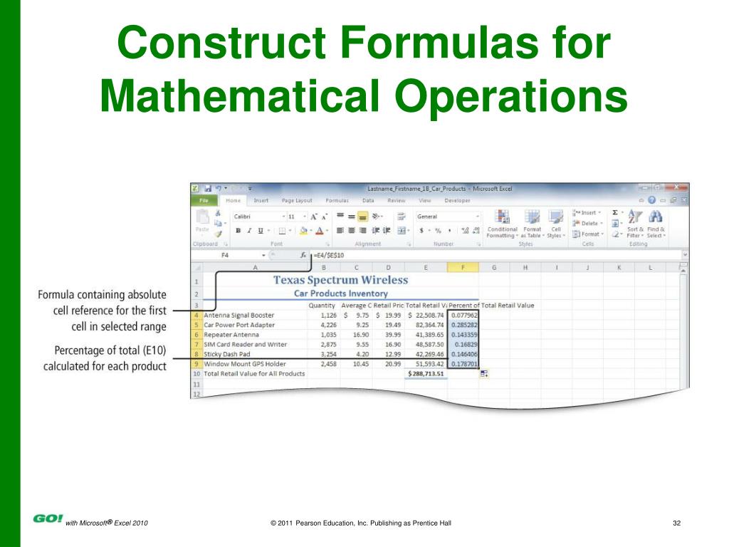 Construct Formulas for Mathematical Operations • Excel formulas begin with an equal sign and include cell references and arithmetic operators.