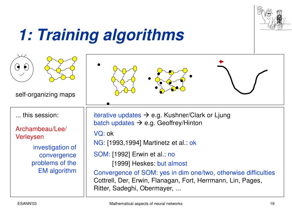 1: Training algorithms self-organizing maps ... this session: iterative updates e.g. Kushner/Clark or Ljung batch updates e.g. Geoffrey/Hinton Archambeau/Lee/ Verleysen VQ: ok NG: [1993,1994] Martinetz et al.: ok investigation of convergence problems of the EM algorithm SOM: [1992] Erwin et al.: no [1999] Heskes: but almost Convergence of SOM: yes in dim one/two, otherwise difficulties Cottrell, Der, Erwin, Flanagan, Fort, Herrmann, Lin, Pages, Ritter, Sadeghi, Obermayer, ... Mathematical aspects of neural networks