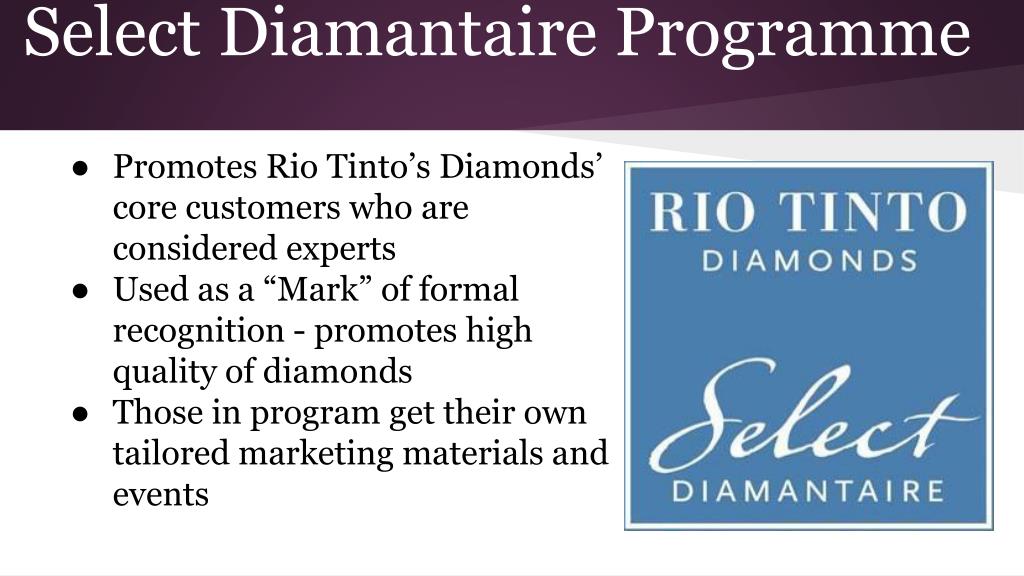 Select Diamantaire Programme • Promotes Rio Tinto’s Diamonds’ core customers who are considered experts • Used as a “Mark” of formal recognition - promotes high quality of diamonds • Those in program get their own tailored marketing materials and events
