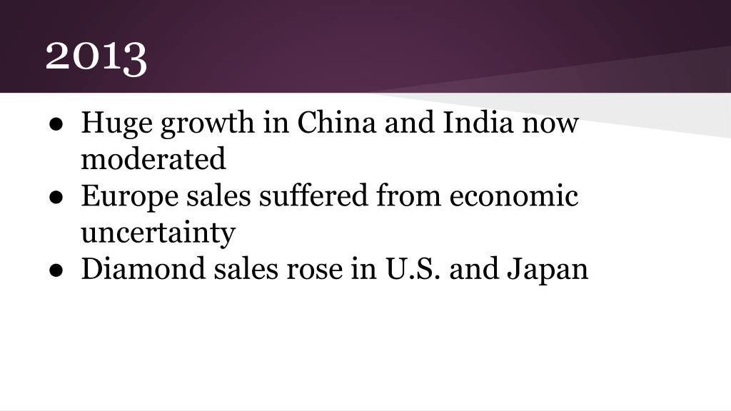 2013 • Huge growth in China and India now moderated • Europe sales suffered from economic uncertainty • Diamond sales rose in U.S. and Japan