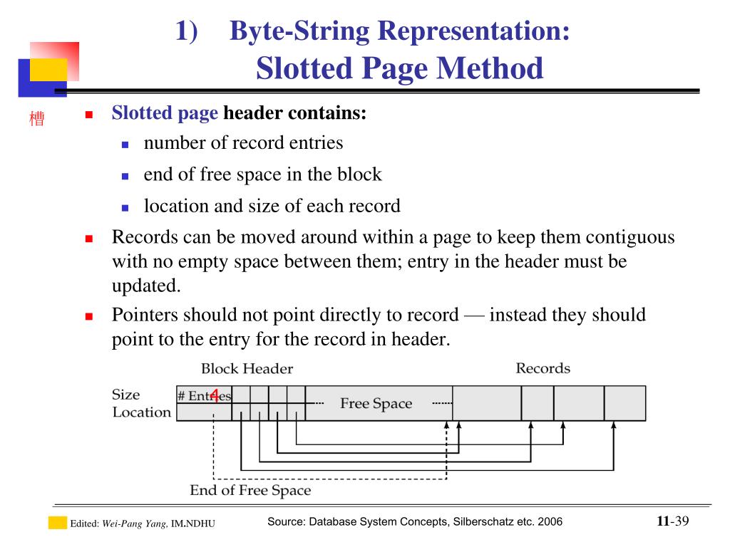 Byte-String Representation:Slotted Page Method (cont.) • Insertion • Deletion How to insert? How to delete?