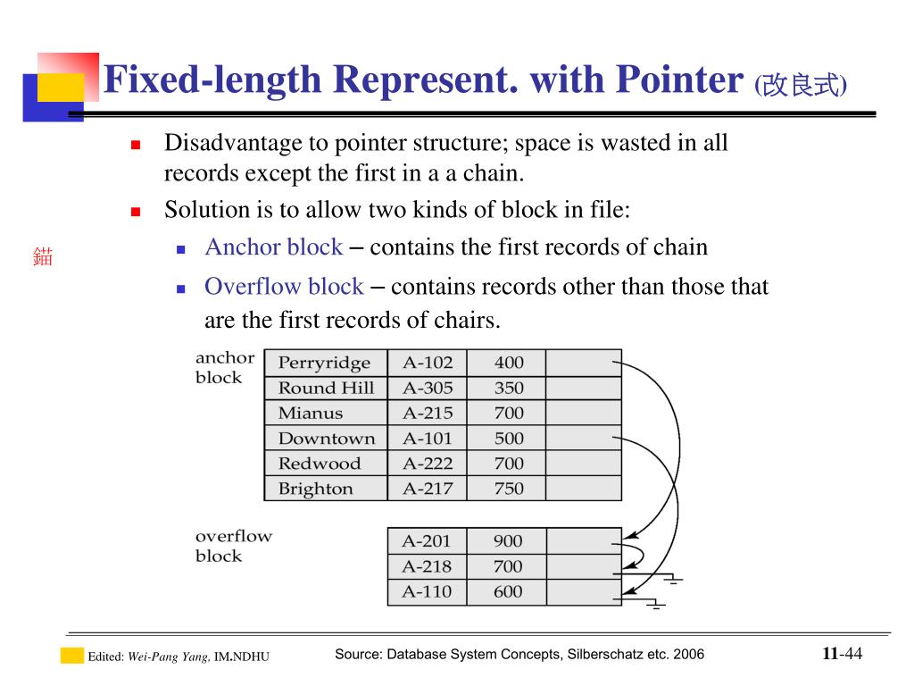 Fixed-length Represent. with Pointer (改良式) • Disadvantage to pointer structure; space is wasted in all records except the first in a a chain. • Solution is to allow two kinds of block in file: • Anchor block– contains the first records of chain • Overflow block– contains records other than those that are the first records of chairs. 錨