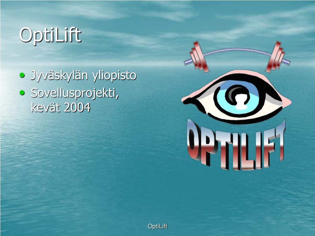 OptiLift. Jyväskylän yliopisto Sovellusprojekti, kevät 2004. Ryhmän jäsenet. Lauri Laasala Olli Lukkarinen Ville Räisänen Vesa Tanhua-Tyrkkö. Ohjaajat ja tilaajan edustajat. Markus Inkeroinen – vastaava ohjaaja Ville Tirronen – tekninen ohjaaja Jukka Viitasalo – KIHU:n puheenjohtaja