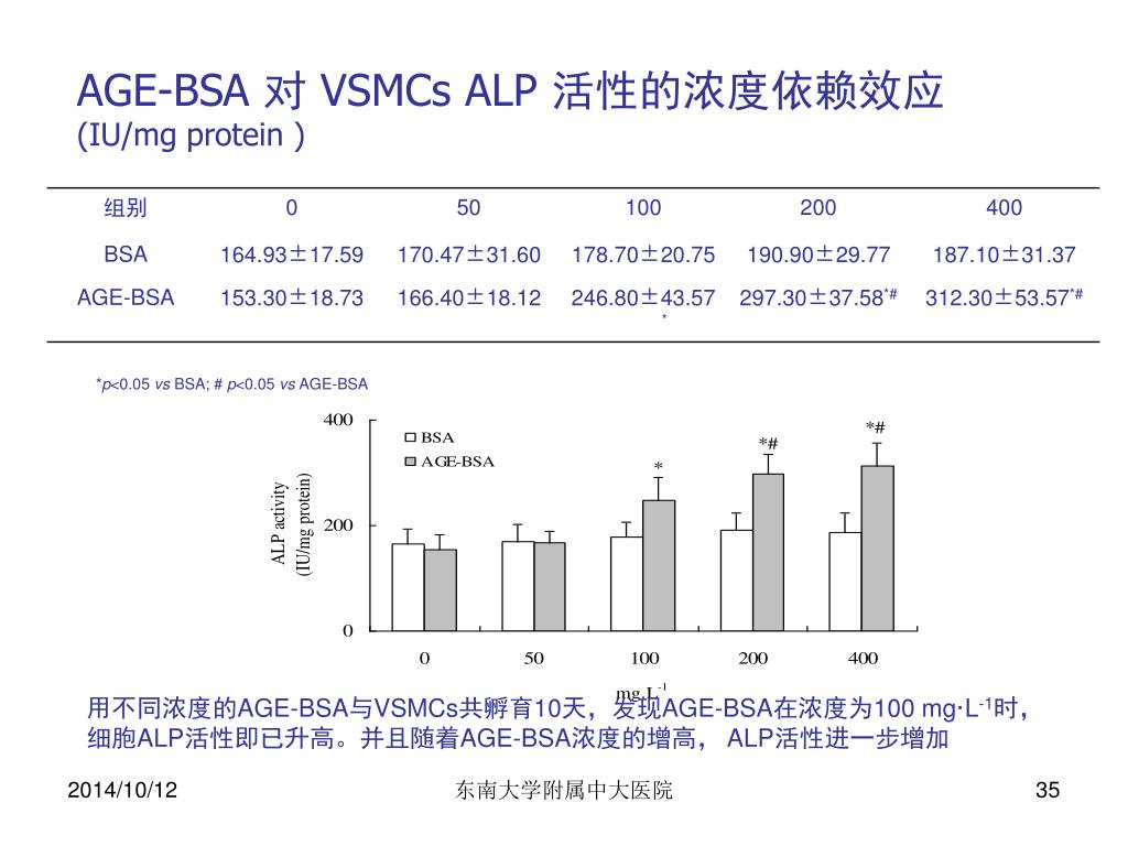 AGE-BSA 对 VSMCs ALP 活性的浓度依赖效应 (IU/mg protein ) *p<0.05 vs BSA; # p<0.05 vs AGE-BSA 用不同浓度的AGE-BSA与VSMCs共孵育10天,发现AGE-BSA在浓度为100 mg·L-1时,细胞ALP活性即已升高。并且随着AGE-BSA浓度的增高, ALP活性进一步增加 东南大学附属中大医院