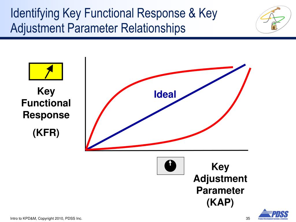Identifying Key Functional Response & Key Adjustment Parameter Relationships Key Functional Response (KFR) Ideal Key Adjustment Parameter (KAP) Intro to KPD&M, Copyright 2010, PDSS Inc.