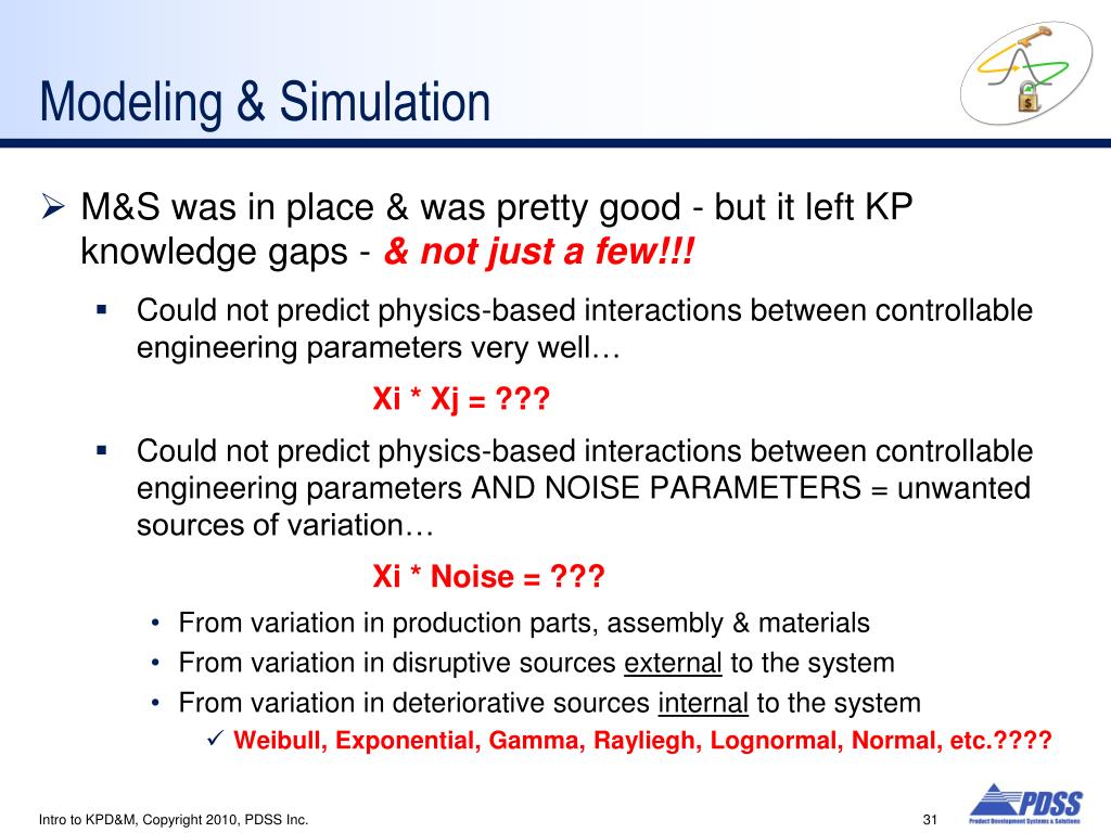 Modeling & Simulation • M&S was in place & was pretty good - but it left KP knowledge gaps - & not just a few!!! • Could not predict physics-based interactions between controllable engineering parameters very well… Xi * Xj = ??? • Could not predict physics-based interactions between controllable engineering parameters AND NOISE PARAMETERS = unwanted sources of variation… Xi * Noise = ??? • From variation in production parts, assembly & materials • From variation in disruptive sources external to the system • From variation in deteriorative sources internal to the system • Weibull, Exponential, Gamma, Rayliegh, Lognormal, Normal, etc.???? Intro to KPD&M, Copyright 2010, PDSS Inc.