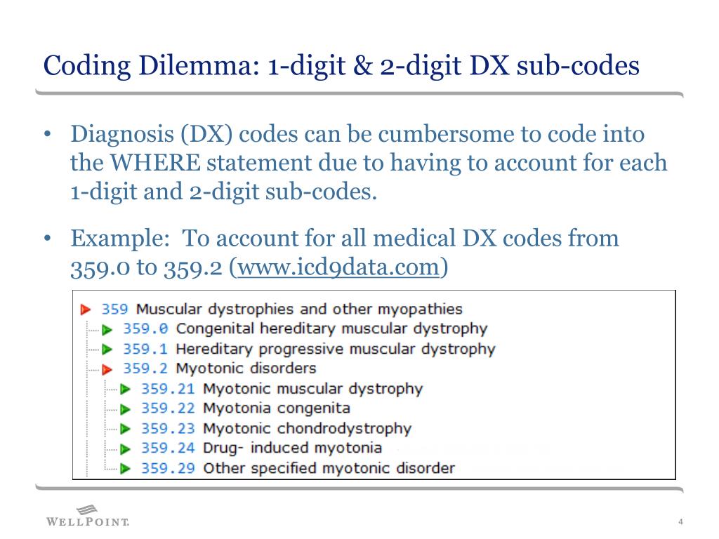 Coding Dilemma: 1-digit & 2-digit DX sub-codes • Diagnosis (DX) codes can be cumbersome to code into the WHERE statement due to having to account for each 1-digit and 2-digit sub-codes. • Example: To account for all medical DX codes from 359.0 to 359.2 (www.icd9data.com)
