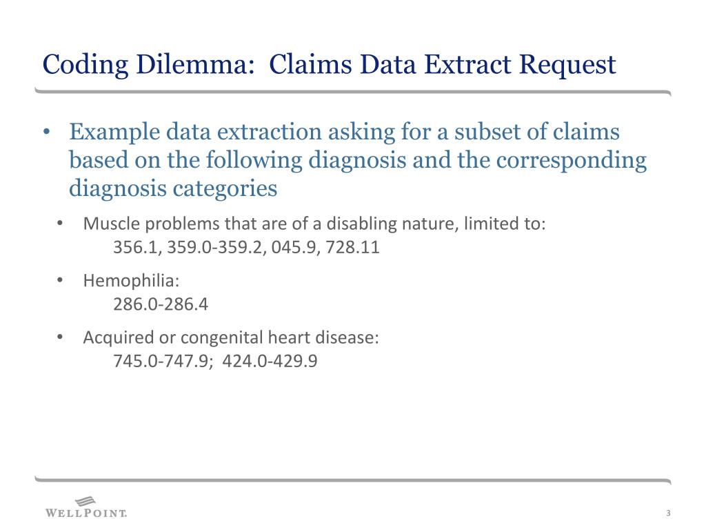Coding Dilemma: Claims Data Extract Request • Example data extraction asking for a subset of claims based on the following diagnosis and the corresponding diagnosis categories • Muscle problems that are of a disabling nature, limited to: 356.1, 359.0-359.2, 045.9, 728.11 • Hemophilia: 286.0-286.4 • Acquired or congenital heart disease: 745.0-747.9; 424.0-429.9