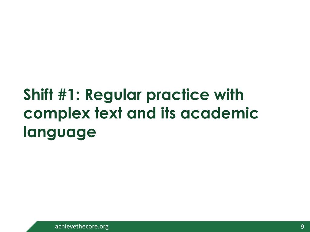 The CCSS Requires Three Shifts in ELA/Literacy Regular practice with complex text and its academic language Reading, writing and speaking grounded in evidence from text, both literary and informational Building knowledge through content-rich nonfiction