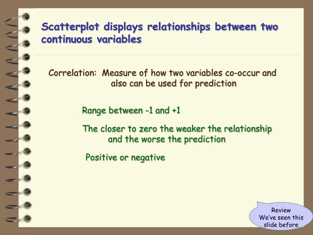 Scatterplot displays relationships between two continuous variables Correlation: Measure of how two variables co-occur and also can be used for prediction Range between -1 and +1 The closer to zero the weaker the relationship and the worse the prediction Positive or negative Review We’ve seen this slide before