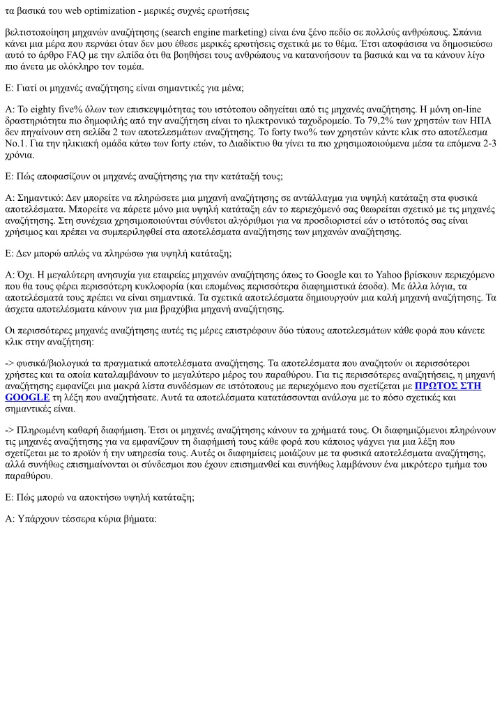 τα βασικά του web optimization - μερικές συχνές ερωτήσεις βελτιστοποίηση μηχανών αναζήτησης (search engine marketing) είναι ένα ξένο πεδίο σε πολλούς ανθρώπους. Σπάνια κάνει μια μέρα που περνάει όταν δεν μου έθεσε μερικές ερωτήσεις σχετικά με το θέμα. Έτσι αποφάσισα να δημοσιεύσω αυτό το άρθρο FAQ με την ελπίδα ότι θα βοηθήσει τους ανθρώπους να κατανοήσουν τα βασικά και να τα κάνουν λίγο πιο άνετα με ολόκληρο τον τομέα. Ε: Γιατί οι μηχανές αναζήτησης είναι σημαντικές για μένα; Α: Το eighty five% όλων των επισκεψιμότητας του ιστότοπου οδηγείται από τις μηχανές αναζήτησης. Η μόνη on-line δραστηριότητα πιο δημοφιλής από την αναζήτηση είναι το ηλεκτρονικό ταχυδρομείο. Το 79,2% των χρηστών των ΗΠΑ δεν πηγαίνουν στη σελίδα 2 των αποτελεσμάτων αναζήτησης. Το forty two% των χρηστών κάντε κλικ στο αποτέλεσμα No.1. Για την ηλικιακή ομάδα κάτω των forty ετών, το Διαδίκτυο θα γίνει τα πιο χρησιμοποιούμενα μέσα τα επόμενα 2-3 χρόνια. Ε: Πώς αποφασίζουν οι μηχανές αναζήτησης για την κατάταξή τους; Α: Σημαντικό: Δεν μπορείτε να πληρώσετε μια μηχανή αναζήτησης σε αντάλλαγμα για υψηλή κατάταξη στα φυσικά αποτελέσματα. Μπορείτε να πάρετε μόνο μια υψηλή κατάταξη εάν το περιεχόμενό σας θεωρείται σχετικό με τις μηχανές αναζήτησης. Στη συνέχεια χρησιμοποιούνται σύνθετοι αλγόριθμοι για να προσδιοριστεί εάν ο ιστότοπός σας είναι χρήσιμος και πρέπει να συμπεριληφθεί στα αποτελέσματα αναζήτησης των μηχανών αναζήτησης. Ε: Δεν μπορώ απλώς να πληρώσω για υψηλή κατάταξη; Α: Όχι. Η μεγαλύτερη ανησυχία για εταιρείες μηχανών αναζήτησης όπως το Google και το Yahoo βρίσκουν περιεχόμενο που θα τους φέρει περισσότερη κυκλοφορία (και επομένως περισσότερα διαφημιστικά έσοδα). Με άλλα λόγια, τα αποτελέσματά τους πρέπει να είναι σημαντικά. Τα σχετικά αποτελέσματα δημιουργούν μια καλή μηχανή αναζήτησης. Τα άσχετα αποτελέσματα κάνουν για μια βραχύβια μηχανή αναζήτησης. Οι περισσότερες μηχανές αναζήτησης αυτές τις μέρες επιστρέφουν δύο τύπους αποτελεσμάτων κάθε φορά που κάνετε κλικ στην αναζήτηση: -> φυσικά/βιολογικά τα πραγματικά αποτελέσματα αναζήτησης. Τα αποτελέσματα που αναζητούν οι περισσότεροι χρήστες και τα οποία καταλαμβάνουν το μεγαλύτερο μέρος του παραθύρου. Για τις περισσότερες αναζητήσεις, η μηχανή αναζήτησης εμφανίζει μια μακρά λίστα συνδέσμων σε ιστότοπους με περιεχόμενο που σχετίζεται με ΠΡΩΤΟΣ ΣΤΗ GOOGLE τη λέξη που αναζητήσατε. Αυτά τα αποτελέσματα κατατάσσονται ανάλογα με το πόσο σχετικές και σημαντικές είναι. -> Πληρωμένη καθαρή διαφήμιση. Έτσι οι μηχανές αναζήτησης κάνουν τα χρήματά τους. Οι διαφημιζόμενοι πληρώνουν τις μηχανές αναζήτησης για να εμφανίζουν τη διαφήμισή τους κάθε φορά που κάποιος ψάχνει για μια λέξη που σχετίζεται με το προϊόν ή την υπηρεσία τους. Αυτές οι διαφημίσεις μοιάζουν με τα φυσικά αποτελέσματα αναζήτησης, αλλά συνήθως επισημαίνονται οι σύνδεσμοι που έχουν επισημανθεί και συνήθως λαμβάνουν ένα μικρότερο τμήμα του παραθύρου. Ε: Πώς μπορώ να αποκτήσω υψηλή κατάταξη; A: Υπάρχουν τέσσερα κύρια βήματα: