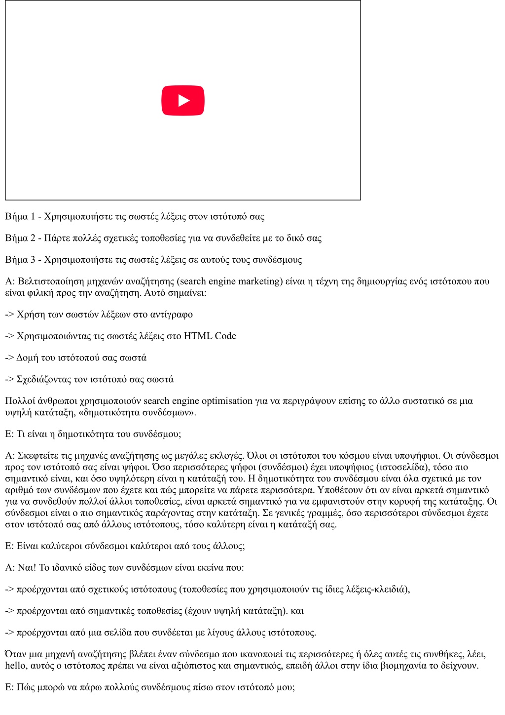Βήμα 1 - Χρησιμοποιήστε τις σωστές λέξεις στον ιστότοπό σας Βήμα 2 - Πάρτε πολλές σχετικές τοποθεσίες για να συνδεθείτε με το δικό σας Βήμα 3 - Χρησιμοποιήστε τις σωστές λέξεις σε αυτούς τους συνδέσμους A: Βελτιστοποίηση μηχανών αναζήτησης (search engine marketing) είναι η τέχνη της δημιουργίας ενός ιστότοπου που είναι φιλική προς την αναζήτηση. Αυτό σημαίνει: -> Χρήση των σωστών λέξεων στο αντίγραφο -> Χρησιμοποιώντας τις σωστές λέξεις στο HTML Code -> Δομή του ιστότοπού σας σωστά -> Σχεδιάζοντας τον ιστότοπό σας σωστά Πολλοί άνθρωποι χρησιμοποιούν search engine optimisation για να περιγράψουν επίσης το άλλο συστατικό σε μια υψηλή κατάταξη, «δημοτικότητα συνδέσμων». Ε: Τι είναι η δημοτικότητα του συνδέσμου; A: Σκεφτείτε τις μηχανές αναζήτησης ως μεγάλες εκλογές. Όλοι οι ιστότοποι του κόσμου είναι υποψήφιοι. Οι σύνδεσμοι προς τον ιστότοπό σας είναι ψήφοι. Όσο περισσότερες ψήφοι (συνδέσμοι) έχει υποψήφιος (ιστοσελίδα), τόσο πιο σημαντικό είναι, και όσο υψηλότερη είναι η κατάταξή του. Η δημοτικότητα του συνδέσμου είναι όλα σχετικά με τον αριθμό των συνδέσμων που έχετε και πώς μπορείτε να πάρετε περισσότερα. Υποθέτουν ότι αν είναι αρκετά σημαντικό για να συνδεθούν πολλοί άλλοι τοποθεσίες, είναι αρκετά σημαντικό για να εμφανιστούν στην κορυφή της κατάταξης. Οι σύνδεσμοι είναι ο πιο σημαντικός παράγοντας στην κατάταξη. Σε γενικές γραμμές, όσο περισσότεροι σύνδεσμοι έχετε στον ιστότοπό σας από άλλους ιστότοπους, τόσο καλύτερη είναι η κατάταξή σας. Ε: Είναι καλύτεροι σύνδεσμοι καλύτεροι από τους άλλους; Α: Ναι! Το ιδανικό είδος των συνδέσμων είναι εκείνα που: -> προέρχονται από σχετικούς ιστότοπους (τοποθεσίες που χρησιμοποιούν τις ίδιες λέξεις-κλειδιά), -> προέρχονται από σημαντικές τοποθεσίες (έχουν υψηλή κατάταξη). και -> προέρχονται από μια σελίδα που συνδέεται με λίγους άλλους ιστότοπους. Όταν μια μηχανή αναζήτησης βλέπει έναν σύνδεσμο που ικανοποιεί τις περισσότερες ή όλες αυτές τις συνθήκες, λέει, hello, αυτός ο ιστότοπος πρέπει να είναι αξιόπιστος και σημαντικός, επειδή άλλοι στην ίδια βιομηχανία το δείχνουν. Ε: Πώς μπορώ να πάρω πολλούς συνδέσμους πίσω στον ιστότοπό μου;