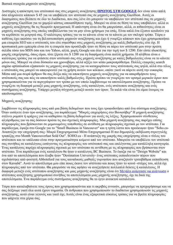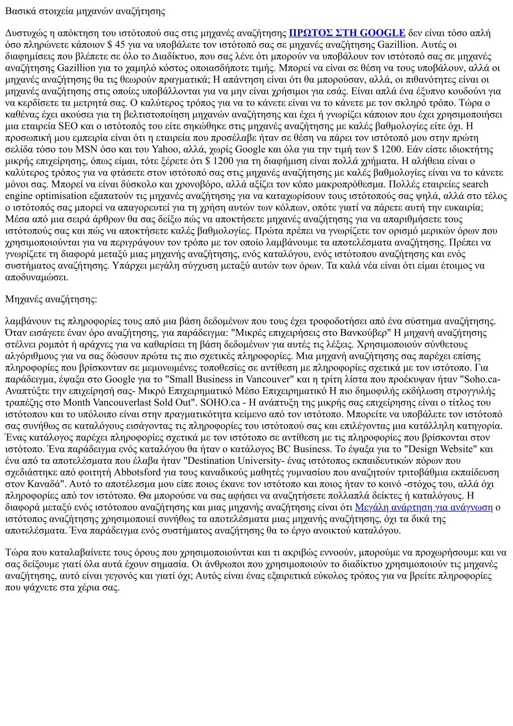 Βασικά στοιχεία μηχανών αναζήτησης Δυστυχώς η απόκτηση του ιστότοπού σας στις μηχανές αναζήτησης ΠΡΩΤΟΣ ΣΤΗ GOOGLE δεν είναι τόσο απλή όσο πληρώνετε κάποιον $ 45 για να υποβάλετε τον ιστότοπό σας σε μηχανές αναζήτησης Gazillion. Αυτές οι διαφημίσεις που βλέπετε σε όλο το Διαδίκτυο, που σας λένε ότι μπορούν να υποβάλουν τον ιστότοπό σας σε μηχανές αναζήτησης Gazillion για το χαμηλό κόστος οποιασδήποτε τιμής. Μπορεί να είναι σε θέση να τους υποβάλουν, αλλά οι μηχανές αναζήτησης θα τις θεωρούν πραγματικά; Η απάντηση είναι ότι θα μπορούσαν, αλλά, οι πιθανότητες είναι οι μηχανές αναζήτησης στις οποίες υποβάλλονται για να μην είναι χρήσιμοι για εσάς. Είναι απλά ένα έξυπνο κουδούνι για να κερδίσετε τα μετρητά σας. Ο καλύτερος τρόπος για να το κάνετε είναι να το κάνετε με τον σκληρό τρόπο. Τώρα ο καθένας έχει ακούσει για τη βελτιστοποίηση μηχανών αναζήτησης και έχει ή γνωρίζει κάποιον που έχει χρησιμοποιήσει μια εταιρεία SEO και ο ιστότοπός του είτε σηκώθηκε στις μηχανές αναζήτησης με καλές βαθμολογίες είτε όχι. Η προσωπική μου εμπειρία είναι ότι η εταιρεία που προσέλαβε ήταν σε θέση να πάρει τον ιστότοπό μου στην πρώτη σελίδα τόσο του MSN όσο και του Yahoo, αλλά, χωρίς Google και όλα για την τιμή των $ 1200. Εάν είστε ιδιοκτήτης μικρής επιχείρησης, όπως είμαι, τότε ξέρετε ότι $ 1200 για τη διαφήμιση είναι πολλά χρήματα. Η αλήθεια είναι ο καλύτερος τρόπος για να φτάσετε στον ιστότοπό σας στις μηχανές αναζήτησης με καλές βαθμολογίες είναι να το κάνετε μόνοι σας. Μπορεί να είναι δύσκολο και χρονοβόρο, αλλά αξίζει τον κόπο μακροπρόθεσμα. Πολλές εταιρείες search engine optimisation εξαπατούν τις μηχανές αναζήτησης για να καταχωρίσουν τους ιστότοπούς σας ψηλά, αλλά στο τέλος ο ιστότοπός σας μπορεί να απαγορευτεί για τη χρήση αυτών των κόλπων, οπότε γιατί να πάρετε αυτή την ευκαιρία; Μέσα από μια σειρά άρθρων θα σας δείξω πώς να αποκτήσετε μηχανές αναζήτησης για να απαριθμήσετε τους ιστότοπούς σας και πώς να αποκτήσετε καλές βαθμολογίες. Πρώτα πρέπει να γνωρίζετε τον ορισμό μερικών όρων που χρησιμοποιούνται για να περιγράψουν τον τρόπο με τον οποίο λαμβάνουμε τα αποτελέσματα αναζήτησης. Πρέπει να γνωρίζετε τη διαφορά μεταξύ μιας μηχανής αναζήτησης, ενός καταλόγου, ενός ιστότοπου αναζήτησης και ενός συστήματος αναζήτησης. Υπάρχει μεγάλη σύγχυση μεταξύ αυτών των όρων. Τα καλά νέα είναι ότι είμαι έτοιμος να αποδυναμώσει. Μηχανές αναζήτησης: λαμβάνουν τις πληροφορίες τους από μια βάση δεδομένων που τους έχει τροφοδοτήσει από ένα σύστημα αναζήτησης. Όταν εισάγετε έναν όρο αναζήτησης, για παράδειγμα: "Μικρές επιχειρήσεις στο Βανκούβερ" Η μηχανή αναζήτησης στέλνει ρομπότ ή αράχνες για να καθαρίσει τη βάση δεδομένων για αυτές τις λέξεις. Χρησιμοποιούν σύνθετους αλγόριθμους για να σας δώσουν πρώτα τις πιο σχετικές πληροφορίες. Μια μηχανή αναζήτησης σας παρέχει επίσης πληροφορίες που βρίσκονταν σε μεμονωμένες τοποθεσίες σε αντίθεση με πληροφορίες σχετικά με τον ιστότοπο. Για παράδειγμα, έψαξα στο Google για το "Small Business in Vancouver" και η τρίτη λίστα που προέκυψαν ήταν "Soho.ca- Αναπτύξτε την επιχείρησή σας- Μικρό Επιχειρηματικό Μέσο Επιχειρηματικό Η πιο δημοφιλής εκδήλωση στρογγυλής τραπέζης στο Month Vancouverlast Sold Out". SOHO.ca - Η ανάπτυξη της μικρής σας επιχείρησης είναι ο τίτλος του ιστότοπου και το υπόλοιπο είναι στην πραγματικότητα κείμενο από τον ιστότοπο. Μπορείτε να υποβάλετε τον ιστότοπό σας συνήθω