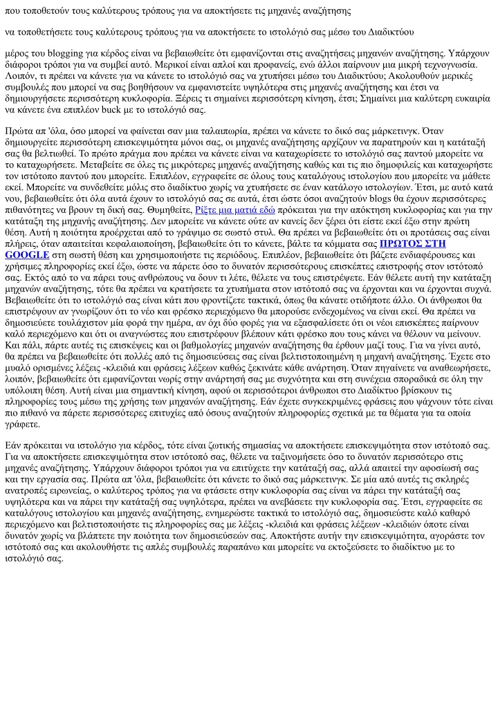 που τοποθετούν τους καλύτερους τρόπους για να αποκτήσετε τις μηχανές αναζήτησης να τοποθετήσετε τους καλύτερους τρόπους για να αποκτήσετε το ιστολόγιό σας μέσω του Διαδικτύου μέρος του blogging για κέρδος είναι να βεβαιωθείτε ότι εμφανίζονται στις αναζητήσεις μηχανών αναζήτησης. Υπάρχουν διάφοροι τρόποι για να συμβεί αυτό. Μερικοί είναι απλοί και προφανείς, ενώ άλλοι παίρνουν μια μικρή τεχνογνωσία. Λοιπόν, τι πρέπει να κάνετε για να κάνετε το ιστολόγιό σας να χτυπήσει μέσω του Διαδικτύου; Ακολουθούν μερικές συμβουλές που μπορεί να σας βοηθήσουν να εμφανιστείτε υψηλότερα στις μηχανές αναζήτησης και έτσι να δημιουργήσετε περισσότερη κυκλοφορία. Ξέρεις τι σημαίνει περισσότερη κίνηση, έτσι; Σημαίνει μια καλύτερη ευκαιρία να κάνετε ένα επιπλέον buck με το ιστολόγιό σας. Πρώτα απ 'όλα, όσο μπορεί να φαίνεται σαν μια ταλαιπωρία, πρέπει να κάνετε το δικό σας μάρκετινγκ. Όταν δημιουργείτε περισσότερη επισκεψιμότητα μόνοι σας, οι μηχανές αναζήτησης αρχίζουν να παρατηρούν και η κατάταξή σας θα βελτιωθεί. Το πρώτο πράγμα που πρέπει να κάνετε είναι να καταχωρίσετε το ιστολόγιό σας παντού μπορείτε να το καταχωρήσετε. Μεταβείτε σε όλες τις μικρότερες μηχανές αναζήτησης καθώς και τις πιο δημοφιλείς και καταχωρήστε τον ιστότοπο παντού που μπορείτε. Επιπλέον, εγγραφείτε σε όλους τους καταλόγους ιστολογίου που μπορείτε να μάθετε εκεί. Μπορείτε να συνδεθείτε μόλις στο διαδίκτυο χωρίς να χτυπήσετε σε έναν κατάλογο ιστολογίων. Έτσι, με αυτό κατά νου, βεβαιωθείτε ότι όλα αυτά έχουν το ιστολόγιό σας σε αυτά, έτσι ώστε όσοι αναζητούν blogs θα έχουν περισσότερες πιθανότητες να βρουν τη δική σας. Θυμηθείτε, Ρίξτε μια ματιά εδώ πρόκειται για την απόκτηση κυκλοφορίας και για την κατάταξη της μηχανής αναζήτησης. Δεν μπορείτε να κάνετε ούτε αν κανείς δεν ξέρει ότι είστε εκεί έξω στην πρώτη θέση. Αυτή η ποιότητα προέρχεται από το γράψιμο σε σωστό στυλ. Θα πρέπει να βεβαιωθείτε ότι οι προτάσεις σας είναι πλήρεις, όταν απαιτείται κεφαλαιοποίηση, βεβαιωθείτε ότι το κάνετε, βάλτε τα κόμματα σας ΠΡΩΤΟΣ ΣΤΗ GOOGLE στη σωστή θέση και χρησιμοποιήστε τις περιόδους. Επιπλέον, βεβαιωθείτε ότι βάζετε ενδιαφέρουσες και χρήσιμες πληροφορίες εκεί έξω, ώστε να πάρετε όσο το δυνατόν περισσότερους επισκέπτες επιστροφής στον ιστότοπό σας. Εκτός από το να πάρει τους ανθρώπους να δουν τι λέτε, θέλετε να τους επιστρέψετε. Εάν θέλετε αυτή την κατάταξη μηχανών αναζήτησης, τότε θα πρέπει να κρατήσετε τα χτυπήματα στον ιστότοπό σας να έρχονται και να έρχονται συχνά. Βεβαιωθείτε ότι το ιστολόγιό σας είναι κάτι που φροντίζετε τακτικά, όπως θα κάνατε οτιδήποτε άλλο. Οι άνθρωποι θα επιστρέψουν αν γνωρίζουν ότι το νέο και φρέσκο περιεχόμενο θα μπορούσε ενδεχομένως να είναι εκεί. Θα πρέπει να δημοσιεύετε τουλάχιστον μία φορά την ημέρα, αν όχι δύο φορές για να εξασφαλίσετε ότι οι νέοι επισκέπτες παίρνουν καλό περιεχόμενο και ότι οι αναγνώστες που επιστρέφουν βλέπουν κάτι φρέσκο που τους κάνει να θέλουν να μείνουν. Και πάλι, πάρτε αυτές τις επισκέψεις και οι βαθμολογίες μηχανών αναζήτησης θα έρθουν μαζί τους. Για να γίνει αυτό, θα πρέπει να βεβαιωθείτε ότι πολλές από τις δημοσιεύσεις σας είναι βελτιστοποιημένη η μηχανή αναζήτησης. Έχετε στο μυαλό ορισμένες λέξεις -κλειδιά και φράσεις λέξεων καθώς ξεκινάτε κάθε ανάρτηση. Όταν πηγαίνετε να αναθεωρήσετε, λοιπόν, βεβαιωθείτε ότι εμφανίζονται νωρί