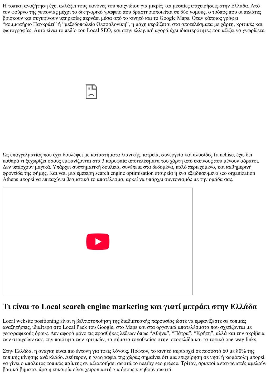 Η τοπική αναζήτηση έχει αλλάξει τους κανόνες του παιχνιδιού για μικρές και μεσαίες επιχειρήσεις στην Ελλάδα. Από τον φούρνο της γειτονιάς μέχρι το δικηγορικό γραφείο που δραστηριοποιείται σε δύο νομούς, ο τρόπος που οι πελάτες βρίσκουν και συγκρίνουν υπηρεσίες περνάει μέσα από το κινητό και το Google Maps. Όταν κάποιος γράφει “κομμωτήριο Παγκράτι” ή “μεζεδοπωλείο Θεσσαλονίκη”, η μάχη κερδίζεται στα αποτελέσματα με χάρτη, κριτικές και φωτογραφίες. Αυτό είναι το πεδίο του Local SEO, και στην ελληνική αγορά έχει ιδιαιτερότητες που αξίζει να γνωρίζετε. Ως επαγγελματίας που έχει δουλέψει με καταστήματα λιανικής, ιατρεία, συνεργεία και αλυσίδες franchise, έχω δει καθαρά τι ξεχωρίζει όσους εμφανίζονται στα 3 κορυφαία αποτελέσματα του χάρτη από εκείνους που μένουν αόρατοι. Δεν υπάρχουν μαγικά. Υπάρχει συστηματική δουλειά, συνέπεια στα δεδομένα, καλό περιεχόμενο, και καθημερινή φροντίδα της φήμης. Και ναι, μια έμπειρη search engine optimisation εταιρεία ή ένα εξειδικευμένο seo organization Athens μπορεί να επιταχύνει θεαματικά το αποτέλεσμα, αρκεί να υπάρχει συντονισμός με την ομάδα σας. Τι είναι το Local search engine marketing και γιατί μετράει στην Ελλάδα Local website positioning είναι η βελτιστοποίηση της διαδικτυακής παρουσίας ώστε να εμφανίζεστε σε τοπικές αναζητήσεις, ιδιαίτερα στο Local Pack του Google, στο Maps και στα οργανικά αποτελέσματα που σχετίζονται με γεωγραφικούς όρους. Δεν αφορά μόνο τις προσθήκες λέξεων όπως “Αθήνα”, “Πάτρα”, “Κρήτη”, αλλά και την ακρίβεια των στοιχείων σας, την ποιότητα των κριτικών, τα σήματα τοποθεσίας στην ιστοσελίδα και τα τοπικά one-way links. Στην Ελλάδα, η ανάγκη είναι πιο έντονη για τρεις λόγους. Πρώτον, το κινητό κυριαρχεί σε ποσοστά 60 με 80% της τοπικής κίνησης ανά κλάδο. Δεύτερον, η γεωγραφία της χώρας σημαίνει ότι μια επιχείρηση σε νησί ή κωμόπολη μπορεί να γίνει ο απόλυτος τοπικός παίκτης αν αξιοποιήσει σωστά το nearby seo greece. Τρίτον, αρκετοί ανταγωνιστές αμελούν βασικά βήματα, άρα η ευκαιρία είναι χειροπιαστή για όσους κινηθούν σωστά.