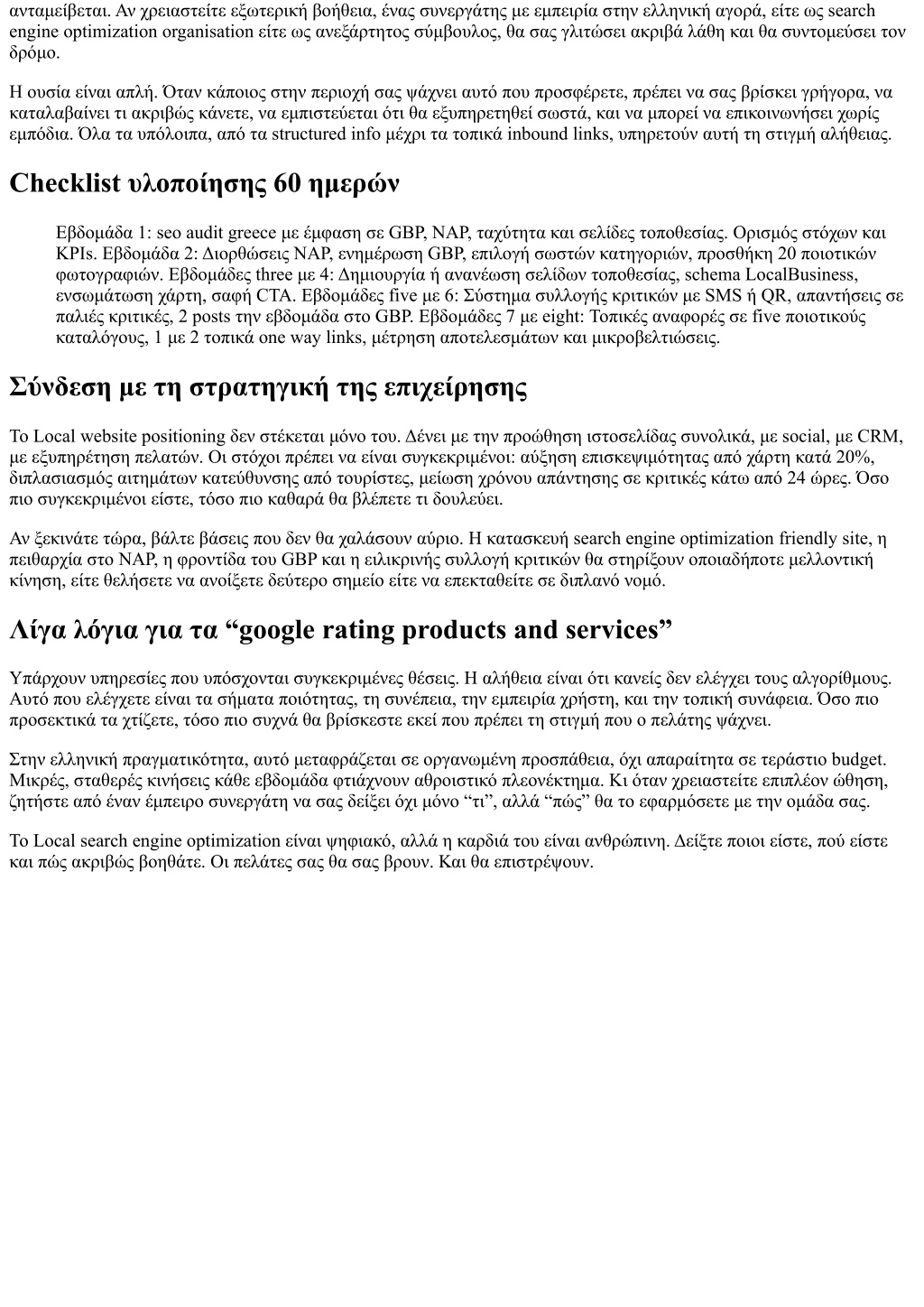 ανταμείβεται. Αν χρειαστείτε εξωτερική βοήθεια, ένας συνεργάτης με εμπειρία στην ελληνική αγορά, είτε ως search engine optimization organisation είτε ως ανεξάρτητος σύμβουλος, θα σας γλιτώσει ακριβά λάθη και θα συντομεύσει τον δρόμο. Η ουσία είναι απλή. Όταν κάποιος στην περιοχή σας ψάχνει αυτό που προσφέρετε, πρέπει να σας βρίσκει γρήγορα, να καταλαβαίνει τι ακριβώς κάνετε, να εμπιστεύεται ότι θα εξυπηρετηθεί σωστά, και να μπορεί να επικοινωνήσει χωρίς εμπόδια. Όλα τα υπόλοιπα, από τα structured info μέχρι τα τοπικά inbound links, υπηρετούν αυτή τη στιγμή αλήθειας. Checklist υλοποίησης 60 ημερών Εβδομάδα 1: seo audit greece με έμφαση σε GBP, NAP, ταχύτητα και σελίδες τοποθεσίας. Ορισμός στόχων και KPIs. Εβδομάδα 2: Διορθώσεις NAP, ενημέρωση GBP, επιλογή σωστών κατηγοριών, προσθήκη 20 ποιοτικών φωτογραφιών. Εβδομάδες three με 4: Δημιουργία ή ανανέωση σελίδων τοποθεσίας, schema LocalBusiness, ενσωμάτωση χάρτη, σαφή CTA. Εβδομάδες five με 6: Σύστημα συλλογής κριτικών με SMS ή QR, απαντήσεις σε παλιές κριτικές, 2 posts την εβδομάδα στο GBP. Εβδομάδες 7 με eight: Τοπικές αναφορές σε five ποιοτικούς καταλόγους, 1 με 2 τοπικά one way links, μέτρηση αποτελεσμάτων και μικροβελτιώσεις. Σύνδεση με τη στρατηγική της επιχείρησης Το Local website positioning δεν στέκεται μόνο του. Δένει με την προώθηση ιστοσελίδας συνολικά, με social, με CRM, με εξυπηρέτηση πελατών. Οι στόχοι πρέπει να είναι συγκεκριμένοι: αύξηση επισκεψιμότητας από χάρτη κατά 20%, διπλασιασμός αιτημάτων κατεύθυνσης από τουρίστες, μείωση χρόνου απάντησης σε κριτικές κάτω από 24 ώρες. Όσο πιο συγκεκριμένοι είστε, τόσο πιο καθαρά θα βλέπετε τι δουλεύει. Αν ξεκινάτε τώρα, βάλτε βάσεις που δεν θα χαλάσουν αύριο. Η κατασκευή search engine optimization friendly site, η πειθαρχία στο NAP, η φροντίδα του GBP και η ειλικρινής συλλογή κριτικών θα στηρίξουν οποιαδήποτε μελλοντική κίνηση, είτε θελήσετε να ανοίξετε δεύτερο σημείο είτε να επεκταθείτε σε διπλανό νομό. Λίγα λόγια για τα “google rating products and services” Υπάρχουν υπηρεσίες που υπόσχονται συγκεκριμένες θέσεις. Η αλήθεια είναι ότι κανείς δεν ελέγχει τους αλγορίθμους. Αυτό που ελέγχετε είναι τα σήματα ποιότητας, τη συνέπεια, την εμπειρία χρήστη, και την τοπική συνάφεια. Όσο πιο προσεκτικά τα χτίζετε, τόσο πιο συχνά θα βρίσκεστε εκεί που πρέπει τη στιγμή που ο πελάτης ψάχνει. Στην ελληνική πραγματικότητα, αυτό μεταφράζεται σε οργανωμένη προσπάθεια, όχι απαραίτητα σε τεράστιο budget. Μικρές, σταθερές κινήσεις κάθε εβδομάδα φτιάχνουν αθροιστικό πλεονέκτημα. Κι όταν χρειαστείτε επιπλέον ώθηση, ζητήστε από έναν έμπειρο συνεργάτη να σας δείξει όχι μόνο “τι”, αλλά “πώς” θα το εφαρμόσετε με την ομάδα σας. Το Local search engine optimization είναι ψηφιακό, αλλά η καρδιά του είναι ανθρώπινη. Δείξτε ποιοι είστε, πού είστε και πώς ακριβώς βοηθάτε. Οι πελάτες σας θα σας βρουν. Και θα επιστρέψουν.