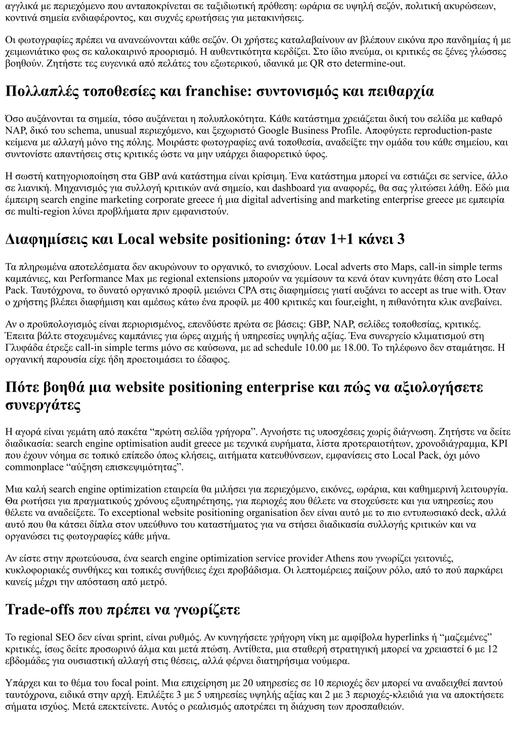 αγγλικά με περιεχόμενο που ανταποκρίνεται σε ταξιδιωτική πρόθεση: ωράρια σε υψηλή σεζόν, πολιτική ακυρώσεων, κοντινά σημεία ενδιαφέροντος, και συχνές ερωτήσεις για μετακινήσεις. Οι φωτογραφίες πρέπει να ανανεώνονται κάθε σεζόν. Οι χρήστες καταλαβαίνουν αν βλέπουν εικόνα προ πανδημίας ή με χειμωνιάτικο φως σε καλοκαιρινό προορισμό. Η αυθεντικότητα κερδίζει. Στο ίδιο πνεύμα, οι κριτικές σε ξένες γλώσσες βοηθούν. Ζητήστε τες ευγενικά από πελάτες του εξωτερικού, ιδανικά με QR στο determine-out. Πολλαπλές τοποθεσίες και franchise: συντονισμός και πειθαρχία Όσο αυξάνονται τα σημεία, τόσο αυξάνεται η πολυπλοκότητα. Κάθε κατάστημα χρειάζεται δική του σελίδα με καθαρό NAP, δικό του schema, unusual περιεχόμενο, και ξεχωριστό Google Business Profile. Αποφύγετε reproduction-paste κείμενα με αλλαγή μόνο της πόλης. Μοιράστε φωτογραφίες ανά τοποθεσία, αναδείξτε την ομάδα του κάθε σημείου, και συντονίστε απαντήσεις στις κριτικές ώστε να μην υπάρχει διαφορετικό ύφος. Η σωστή κατηγοριοποίηση στα GBP ανά κατάστημα είναι κρίσιμη. Ένα κατάστημα μπορεί να εστιάζει σε service, άλλο σε λιανική. Μηχανισμός για συλλογή κριτικών ανά σημείο, και dashboard για αναφορές, θα σας γλιτώσει λάθη. Εδώ μια έμπειρη search engine marketing corporate greece ή μια digital advertising and marketing enterprise greece με εμπειρία σε multi-region λύνει προβλήματα πριν εμφανιστούν. Διαφημίσεις και Local website positioning: όταν 1+1 κάνει 3 Τα πληρωμένα αποτελέσματα δεν ακυρώνουν το οργανικό, το ενισχύουν. Local adverts στο Maps, call-in simple terms καμπάνιες, και Performance Max με regional extensions μπορούν να γεμίσουν τα κενά όταν κυνηγάτε θέση στο Local Pack. Ταυτόχρονα, το δυνατό οργανικό προφίλ μειώνει CPA στις διαφημίσεις γιατί αυξάνει το accept as true with. Όταν ο χρήστης βλέπει διαφήμιση και αμέσως κάτω ένα προφίλ με 400 κριτικές και four,eight, η πιθανότητα κλικ ανεβαίνει. Αν ο προϋπολογισμός είναι περιορισμένος, επενδύστε πρώτα σε βάσεις: GBP, NAP, σελίδες τοποθεσίας, κριτικές. Έπειτα βάλτε στοχευμένες καμπάνιες για ώρες αιχμής ή υπηρεσίες υψηλής αξίας. Ένα συνεργείο κλιματισμού στη Γλυφάδα έτρεξε call-in simple terms μόνο σε καύσωνα, με ad schedule 10.00 με 18.00. Το τηλέφωνο δεν σταμάτησε. Η οργανική παρουσία είχε ήδη προετοιμάσει το έδαφος. Πότε βοηθά μια website positioning enterprise και πώς να αξιολογήσετε συνεργάτες Η αγορά είναι γεμάτη από πακέτα “πρώτη σελίδα γρήγορα”. Αγνοήστε τις υποσχέσεις χωρίς διάγνωση. Ζητήστε να δείτε διαδικασία: search engine optimisation audit greece με τεχνικά ευρήματα, λίστα προτεραιοτήτων, χρονοδιάγραμμα, KPI που έχουν νόημα σε τοπικό επίπεδο όπως κλήσεις, αιτήματα κατευθύνσεων, εμφανίσεις στο Local Pack, όχι μόνο commonplace “αύξηση επισκεψιμότητας”. Μια καλή search engine optimization εταιρεία θα μιλήσει για περιεχόμενο, εικόνες, ωράρια, και καθημερινή λειτουργία. Θα ρωτήσει για πραγματικούς χρόνους εξυπηρέτησης, για περιοχές που θέλετε να στοχεύσετε και για υπηρεσίες που θέλετε να αναδείξετε. Το exceptional website positioning organisation δεν είναι αυτό με το πιο εντυπωσιακό deck, αλλά αυτό που θα κάτσει δίπλα στον υπεύθυνο του καταστήματος για να στήσει διαδικασία συλλογής κριτικών και να οργανώσει τις φωτογραφίες κάθε μήνα. Αν είστε στην πρωτεύουσα, ένα search engine optimization service provider Athens που γνωρίζει γειτονιές, κυκλοφοριακές συνθήκες και τοπικές συνήθειες έχει προβάδισμα. Οι λεπτομέρειες παίζουν ρόλο, από το πού παρκάρει κανείς μέχρι την απόσταση από μετρό. Trade-offs που πρέπει να γνωρίζετε Το regional SEO δεν είναι sprint, είναι ρυθμός. Αν κυνηγήσετε γρήγορη νίκη με αμφίβολα hyperlinks ή “μαζεμέν