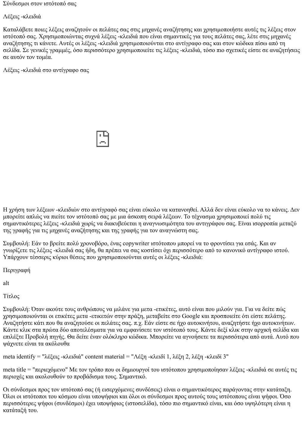 Σύνδεσμοι στον ιστότοπό σας Λέξεις -κλειδιά Καταλάβετε ποιες λέξεις αναζητούν οι πελάτες σας στις μηχανές αναζήτησης και χρησιμοποιήστε αυτές τις λέξεις στον ιστότοπό σας. Χρησιμοποιώντας συχνά λέξεις -κλειδιά που είναι σημαντικές για τους πελάτες σας, λέτε στις μηχανές αναζήτησης τι κάνετε. Αυτές οι λέξεις -κλειδιά χρησιμοποιούνται στο αντίγραφο σας και στον κώδικα πίσω από τη σελίδα. Σε γενικές γραμμές, όσο περισσότερο χρησιμοποιείτε τις λέξεις -κλειδιά, τόσο πιο σχετικές είστε σε αναζητήσεις σε αυτόν τον τομέα. Λέξεις -κλειδιά στο αντίγραφο σας Η χρήση των λέξεων -κλειδιών στο αντίγραφό σας είναι εύκολο να κατανοηθεί. Αλλά δεν είναι εύκολο να το κάνεις. Δεν μπορείτε απλώς να πιείτε τον ιστότοπό σας με μια άσκοπη σειρά λέξεων. Το τέχνασμα χρησιμοποιεί πολύ τις σημαντικότερες λέξεις -κλειδιά χωρίς να διακυβεύεται η αναγνωσιμότητα του αντιγράφου σας. Είναι ισορροπία μεταξύ της γραφής για τις μηχανές αναζήτησης και της γραφής για τον αναγνώστη σας. Συμβουλή: Εάν το βρείτε πολύ χρονοβόρο, ένας copywriter ιστότοπου μπορεί να το φροντίσει για εσάς. Και αν γνωρίζετε τις λέξεις -κλειδιά σας ήδη, θα πρέπει να σας κοστίσει όχι περισσότερο από το κανονικό αντίγραφο ιστού. Υπάρχουν τέσσερις κύριοι θέσεις που χρησιμοποιούνται αυτές οι λέξεις -κλειδιά: Περιγραφή alt Τίτλος Συμβουλή: Όταν ακούτε τους ανθρώπους να μιλάνε για μετα -ετικέτες, αυτό είναι που μιλούν για. Για να δείτε πώς χρησιμοποιούνται οι ετικέτες μετα -ετικετών στην πράξη, μεταβείτε στο Google και προσποιείτε ότι είστε πελάτης. Αναζητήστε κάτι που θα αναζητούσε οι πελάτες σας. π.χ. Εάν είστε σε ήχο αυτοκινήτου, αναζητήστε ήχο αυτοκινήτων. Κάντε κλικ στα πρώτα δύο αποτελέσματα για να εμφανίσετε τον ιστότοπό τους. Κάντε δεξί κλικ στην αρχική σελίδα και επιλέξτε Προβολή πηγής. Θα δείτε έναν ολόκληρο κώδικα. Μπορείτε να αγνοήσετε τα περισσότερα από αυτά. Αυτό που ψάχνετε είναι τα ακόλουθα meta identify = "λέξεις -κλειδιά" content material = "Λέξη -κλειδί 1, λέξη 2, λέξη -κλειδί 3" meta title = "περιεχόμενο" Με τον τρόπο που οι δημιουργοί του ιστότοπου χρησιμοποίησαν λέξεις -κλειδιά σε αυτές τις περιοχές και ακολουθούν το προβάδισμα τους. Σημαντικό. Οι σύνδεσμοι προς τον ιστότοπό σας (ή εισερχόμενες συνδέσεις) είναι ο σημαντικότερος παράγοντας στην κατάταξη. Όλοι οι ιστότοποι του κόσμου είναι υποψήφιοι και όλοι οι σύνδεσμοι προς αυτούς τους ιστότοπους είναι ψήφοι. Όσο περισσότερες ψήφοι (συνδέσμοι) έχει υποψήφιος (ιστοσελίδα), τόσο πιο σημαντικό είναι, και όσο υψηλότερη είναι η κατάταξή του.