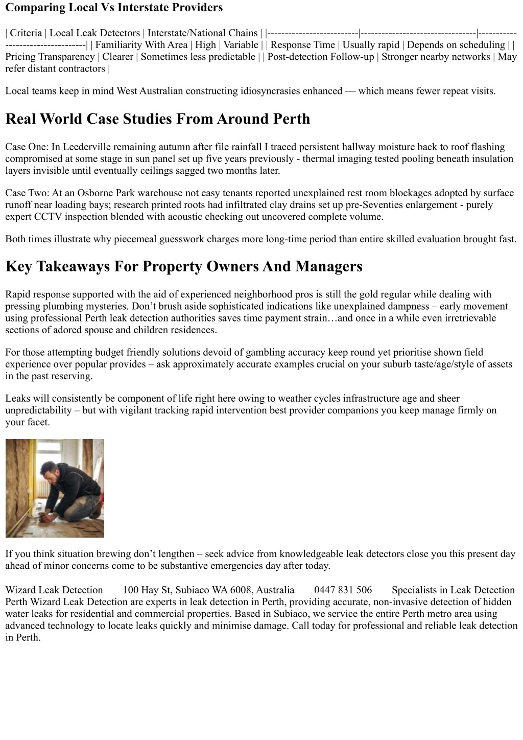 Comparing Local Vs Interstate Providers | Criteria | Local Leak Detectors | Interstate/National Chains | |--------------------------|---------------------------------|----------- -----------------------| | Familiarity With Area | High | Variable | | Response Time | Usually rapid | Depends on scheduling | | Pricing Transparency | Clearer | Sometimes less predictable | | Post-detection Follow-up | Stronger nearby networks | May refer distant contractors | Local teams keep in mind West Australian constructing idiosyncrasies enhanced — which means fewer repeat visits. Real World Case Studies From Around Perth Case One: In Leederville remaining autumn after file rainfall I traced persistent hallway moisture back to roof flashing compromised at some stage in sun panel set up five years previously - thermal imaging tested pooling beneath insulation layers invisible until eventually ceilings sagged two months later. Case Two: At an Osborne Park warehouse not easy tenants reported unexplained rest room blockages adopted by surface runoff near loading bays; research printed roots had infiltrated clay drains set up pre-Seventies enlargement - purely expert CCTV inspection blended with acoustic checking out uncovered complete volume. Both times illustrate why piecemeal guesswork charges more long-time period than entire skilled evaluation brought fast. Key Takeaways For Property Owners And Managers Rapid response supported with the aid of experienced neighborhood pros is still the gold regular while dealing with pressing plumbing mysteries. Don’t brush aside sophisticated indications like unexplained dampness – early movement using professional Perth leak detection authorities saves time payment strain…and once in a while even irretrievable sections of adored spouse and children residences. For those attempting budget friendly solutions devoid of gambling accuracy keep round yet prioritise shown field experience over popular provides – ask approximately accurate examples crucial on your suburb taste/age/style of assets in the past reserving. Leaks will consistently be component of life right here owing to weather cycles infrastructure age and sheer unpredictability – but with vigilant tracking rapid intervention best provider companions you keep manage firmly on your facet. If you think situation brewing don’t lengthen – seek advice from knowledgeable leak detectors close you this present day ahead of minor concerns come to be substantive emergencies day after today. Wizard Leak Detection Perth Wizard Leak Detection are experts in leak detection in Perth, providing accurate, non-invasive detection of hidden water leaks for residential and commercial properties. Based in Subiaco, we service the entire Perth metro area using advanced technology to locate leaks quickly and minimise damage. Call today for professional and reliable leak detection in Perth. 100 Hay St, Subiaco WA 6008, Australia 0447 831 506 Specialists in Leak Detection