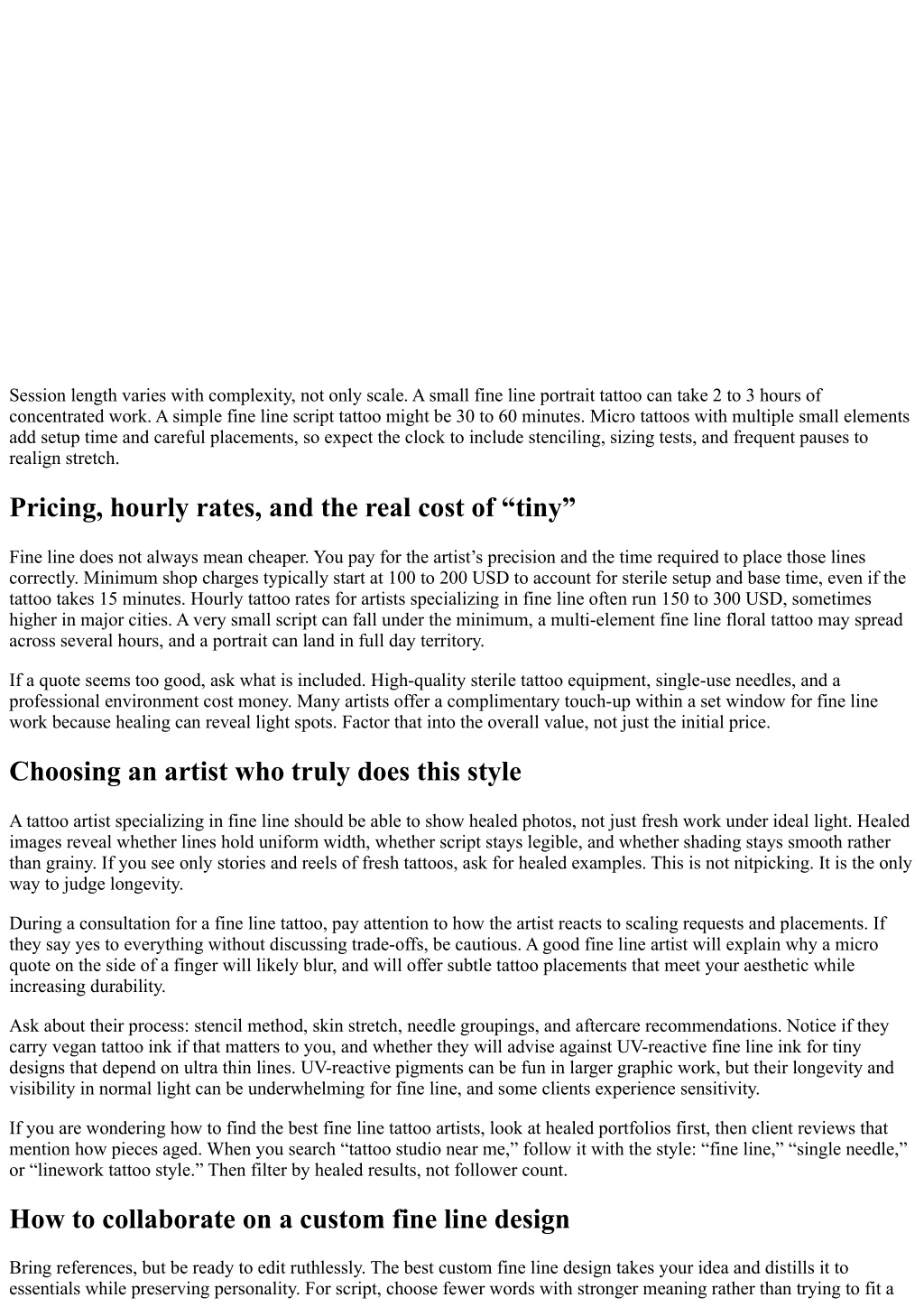 Session length varies with complexity, not only scale. A small fine line portrait tattoo can take 2 to 3 hours of concentrated work. A simple fine line script tattoo might be 30 to 60 minutes. Micro tattoos with multiple small elements add setup time and careful placements, so expect the clock to include stenciling, sizing tests, and frequent pauses to realign stretch. Pricing, hourly rates, and the real cost of “tiny” Fine line does not always mean cheaper. You pay for the artist’s precision and the time required to place those lines correctly. Minimum shop charges typically start at 100 to 200 USD to account for sterile setup and base time, even if the tattoo takes 15 minutes. Hourly tattoo rates for artists specializing in fine line often run 150 to 300 USD, sometimes higher in major cities. A very small script can fall under the minimum, a multi-element fine line floral tattoo may spread across several hours, and a portrait can land in full day territory. If a quote seems too good, ask what is included. High-quality sterile tattoo equipment, single-use needles, and a professional environment cost money. Many artists offer a complimentary touch-up within a set window for fine line work because healing can reveal light spots. Factor that into the overall value, not just the initial price. Choosing an artist who truly does this style A tattoo artist specializing in fine line should be able to show healed photos, not just fresh work under ideal light. Healed images reveal whether lines hold uniform width, whether script stays legible, and whether shading stays smooth rather than grainy. If you see only stories and reels of fresh tattoos, ask for healed examples. This is not nitpicking. It is the only way to judge longevity. During a consultation for a fine line tattoo, pay attention to how the artist reacts to scaling requests and placements. If they say yes to everything without discussing trade-offs, be cautious. A good fine line artist will explain why a micro quote on the side of a finger will likely blur, and will offer subtle tattoo placements that meet your aesthetic while increasing durability. Ask about their process: stencil method, skin stretch, needle groupings, and aftercare recommendations. Notice if they carry vegan tattoo ink if that matters to you, and whether they will advise against UV-reactive fine line ink for tiny designs that depend on ultra thin lines. UV-reactive pigments can be fun in larger graphic work, but their longevity and visibility in normal light can be underwhelming for fine line, and some clients experience sensitivity. If you are wondering how to find the best fine line tattoo artists, look at healed portfolios first, then client reviews that mention how pieces aged. When you search “tattoo studio near me,” follow it with the style: “fine line,” “single needle,” or “linework tattoo style.” Then filter by healed results, not follower count. How to collaborate on a custom fine line design Bring references, but be ready to edit ruthlessly. The best custom fine line design takes your idea and distills it to essentials while preserving personality. For script, choose fewer words with stronger meaning rather than trying to fit a