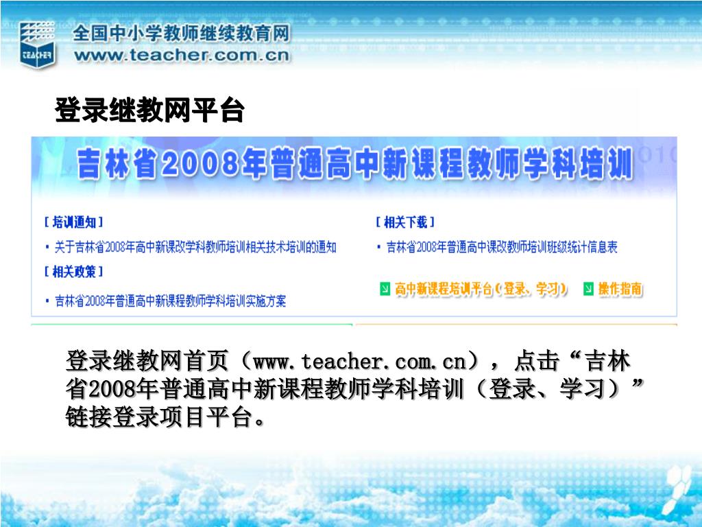登录继教网平台 登录继教网首页(www.teacher.com.cn),点击“吉林省2008年普通高中新课程教师学科培训(登录、学习)”链接登录项目平台。