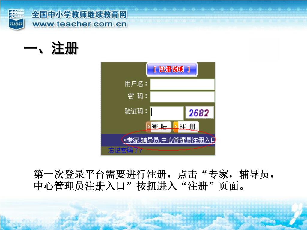 班主任操作指南. 主要工作职责 : 学员培训监控。班主任随时查看每位学员的 网上操作数据,督促跟进不足的学员。 协助辅导教师编辑 《 学习简报 》 。 为班主任提供学员学习过程信息,班主任评定成绩。. 登录继教网平台. 登录继教网首页( www.teacher.com.cn ),点击“吉林省 2008 年普通高中新课程教师学科培训(登录、学习)”链接登录项目平台。. 一、注册. 第一次登录平台需要进行注册,点击 “ 专家,辅导员,中心管理员注册入口 ” 按扭进入 “ 注册 ” 页面。.