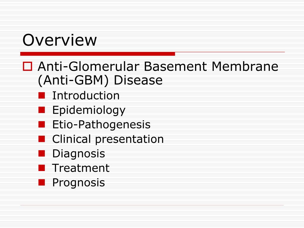 Overview • Anti-Glomerular Basement Membrane (Anti-GBM) Disease • Introduction • Epidemiology • Etio-Pathogenesis • Clinical presentation • Diagnosis • Treatment • Prognosis