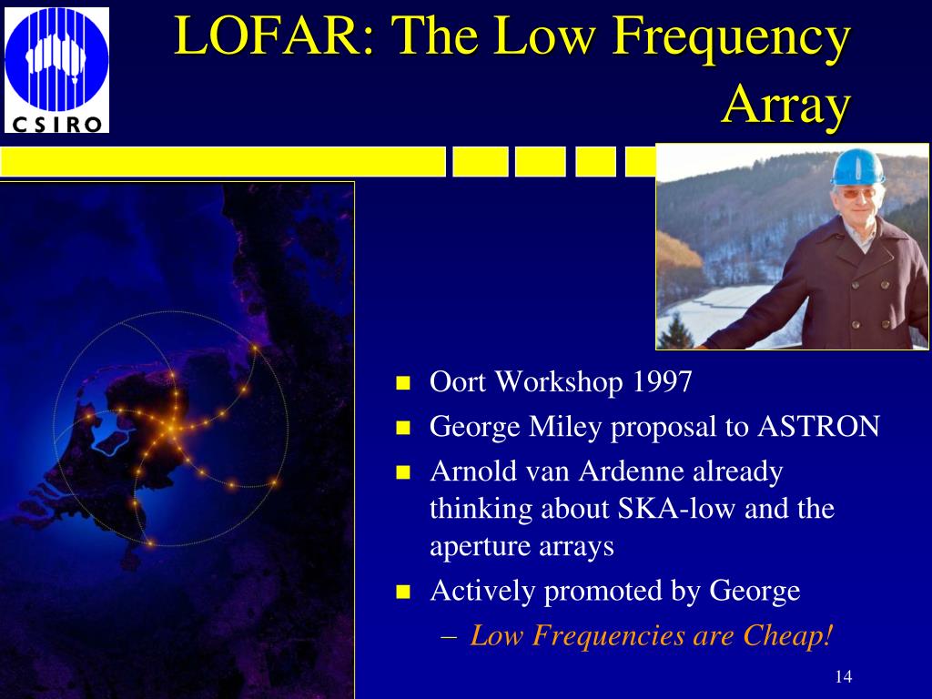 LOFAR: The Low Frequency Array • Oort Workshop 1997 • George Miley proposal to ASTRON • Arnold van Ardenne already thinking about SKA-low and the aperture arrays • Actively promoted by George • Low Frequencies are Cheap!