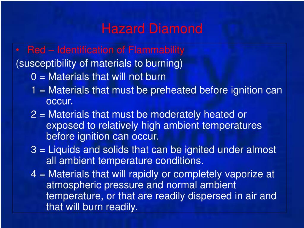 Hazard Diamond • Red – Identification of Flammability (susceptibility of materials to burning) 0 = Materials that will not burn 1 = Materials that must be preheated before ignition can occur. 2 = Materials that must be moderately heated or exposed to relatively high ambient temperatures before ignition can occur. 3 = Liquids and solids that can be ignited under almost all ambient temperature conditions. 4 = Materials that will rapidly or completely vaporize at atmospheric pressure and normal ambient temperature, or that are readily dispersed in air and that will burn readily.