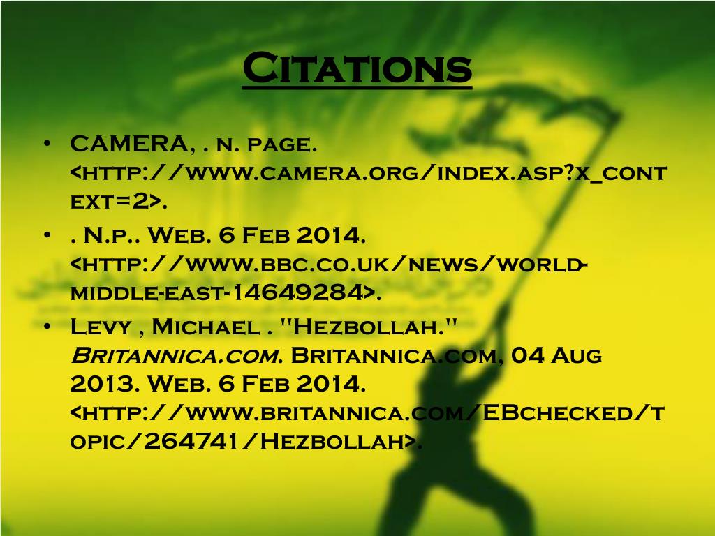 Citations • CAMERA, . n. page. <http://www.camera.org/index.asp?x_context=2>. • . N.p.. Web. 6 Feb 2014. <http://www.bbc.co.uk/news/world-middle-east-14649284>. • Levy , Michael . "Hezbollah." Britannica.com. Britannica.com, 04 Aug 2013. Web. 6 Feb 2014. <http://www.britannica.com/EBchecked/topic/264741/Hezbollah>.