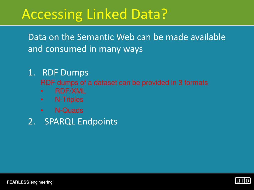 Accessing Linked Data? • Data on the Semantic Web can be made available and consumed in many ways • RDF Dumps • RDF dumps of a dataset can be provided in 3 formats • RDF/XML • N-Triples • N-Quads • SPARQL Endpoints