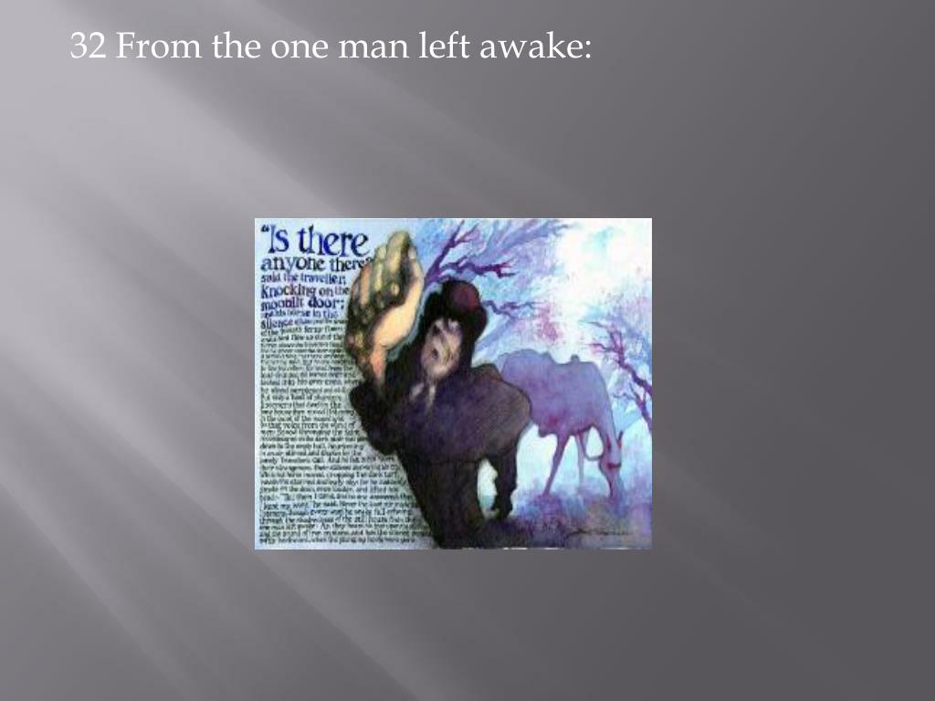 … 5 The fact that the Traveller arrived on horseback, and the use of old-fashioned words like “spake”, “hearkening” and “ay” suggest that this poem is set in an earlier time. 6a Initially the Traveller knocked, an ordinary way of announcing one’s arrival at a door. Then when there was no reply, he banged much harder, in case his initial knock had been too soft. They reinforce the idea of no humans being present.