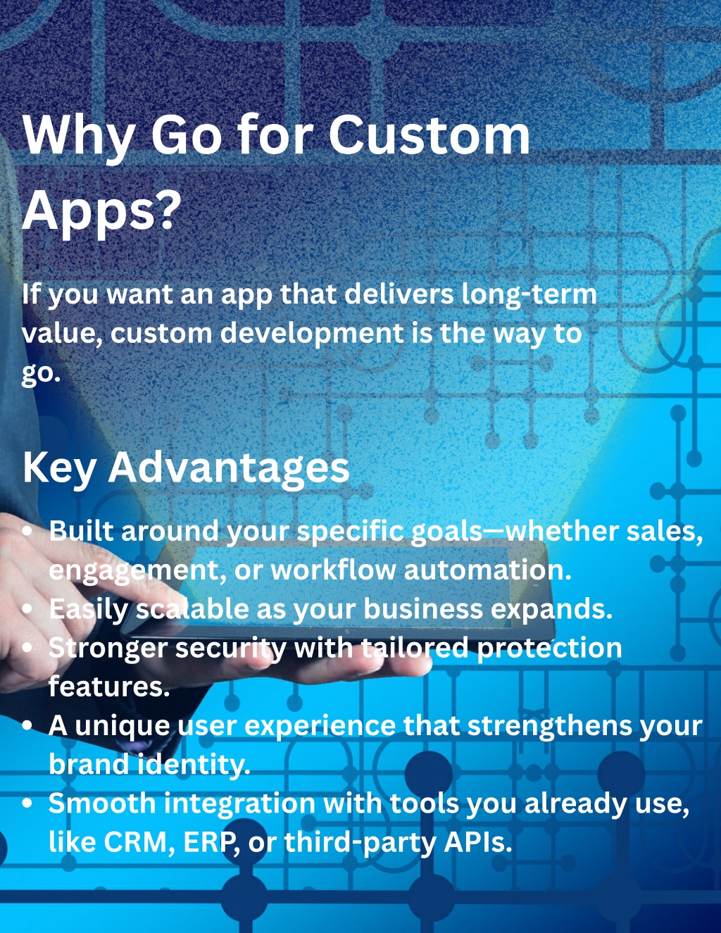 Why Go for Custom Apps? If you want an app that delivers long-term value, custom development is the way to go. Key Advantages Built around your specific goals—whether sales, engagement, or workflow automation. Easily scalable as your business expands. Stronger security with tailored protection features. A unique user experience that strengthens your brand identity. Smooth integration with tools you already use, like CRM, ERP, or third-party APIs.