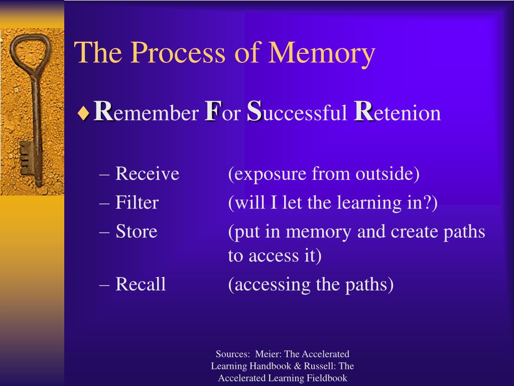 The Process of Memory • Remember For Successful Retenion • Receive (exposure from outside) • Filter (will I let the learning in?) • Store (put in memory and create paths to access it) • Recall (accessing the paths) Sources: Meier: The Accelerated Learning Handbook & Russell: The Accelerated Learning Fieldbook