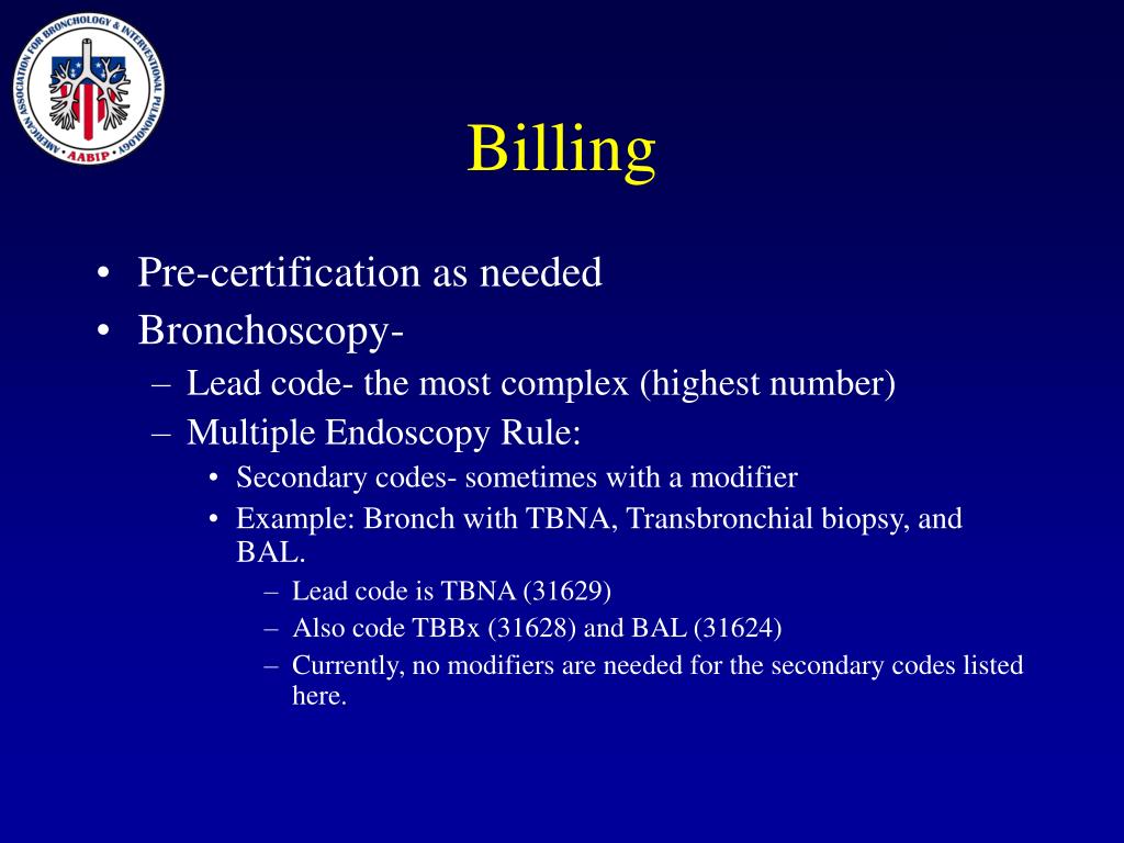 Billing • Pre-certification as needed • Bronchoscopy- • Lead code- the most complex (highest number) • Multiple Endoscopy Rule: • Secondary codes- sometimes with a modifier • Example: Bronch with TBNA, Transbronchial biopsy, and BAL. • Lead code is TBNA (31629) • Also code TBBx (31628) and BAL (31624) • Currently, no modifiers are needed for the secondary codes listed here.