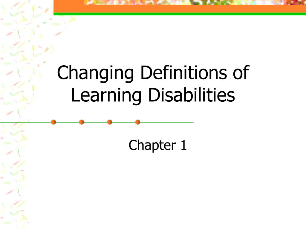Changing Definitions of Learning Disabilities. Chapter 1. Clinical (1920-1940) LD differentiated from other disabilities Classroom Transition (1940-1960) classroom instruction Consolidation (1962-1975) political pressure to consolidate various groups into one field.