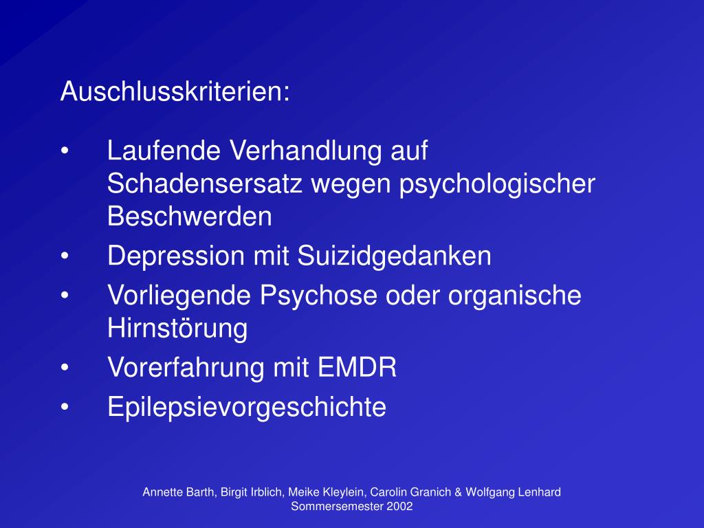 Auschlusskriterien: • Laufende Verhandlung auf Schadensersatz wegen psychologischer Beschwerden • Depression mit Suizidgedanken • Vorliegende Psychose oder organische Hirnstörung • Vorerfahrung mit EMDR • Epilepsievorgeschichte Annette Barth, Birgit Irblich, Meike Kleylein, Carolin Granich & Wolfgang Lenhard Sommersemester 2002
