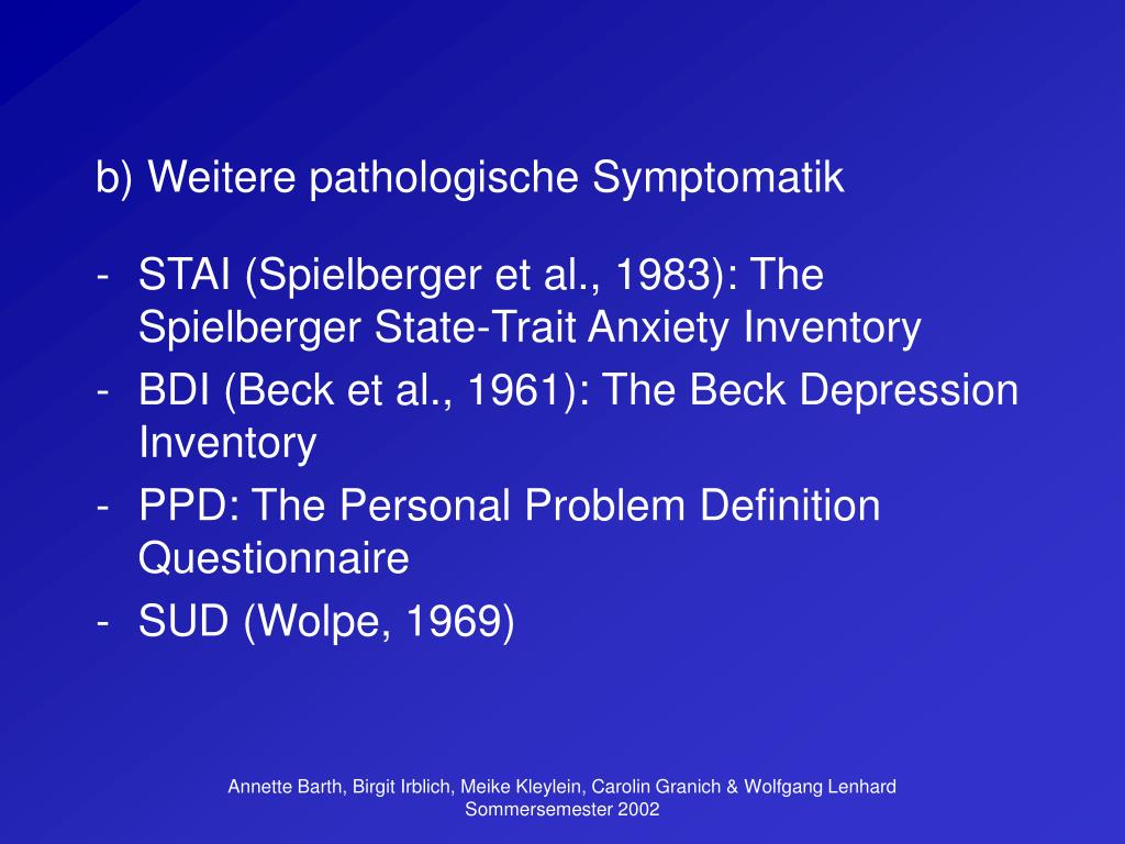 b) Weitere pathologische Symptomatik - STAI (Spielberger et al., 1983): The Spielberger State-Trait Anxiety Inventory - BDI (Beck et al., 1961): The Beck Depression Inventory • PPD: The Personal Problem Definition Questionnaire • SUD (Wolpe, 1969) Annette Barth, Birgit Irblich, Meike Kleylein, Carolin Granich & Wolfgang Lenhard Sommersemester 2002