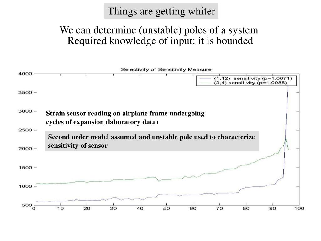 Things are getting whiter We can determine (unstable) poles of a system Required knowledge of input: it is bounded Strain sensor reading on airplane frame undergoing cycles of expansion (laboratory data) Second order model assumed and unstable pole used to characterize sensitivity of sensor