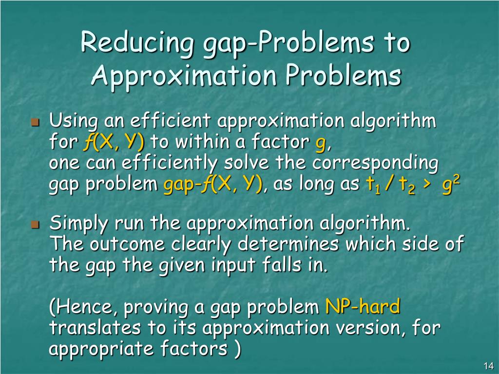 Reducing gap-Problems to Approximation Problems • Using an efficient approximation algorithm for ƒ(X, Y) to within a factor g,one can efficiently solve the corresponding gap problem gap-ƒ(X, Y), as long as t1 /t2 > g2 • Simply run the approximation algorithm.The outcome clearly determines which side of the gap the given input falls in.(Hence, proving a gap problem NP-hard translates to its approximation version, for appropriate factors )