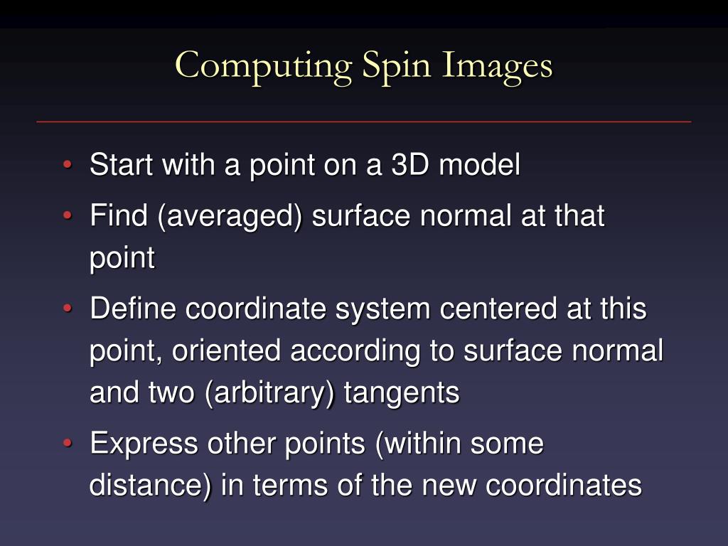 Computing Spin Images • Start with a point on a 3D model • Find (averaged) surface normal at that point • Define coordinate system centered at this point, oriented according to surface normal and two (arbitrary) tangents • Express other points (within some distance) in terms of the new coordinates