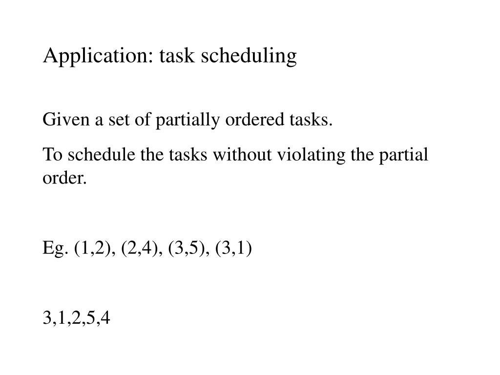 Application: task scheduling Given a set of partially ordered tasks. To schedule the tasks without violating the partial order. Eg. (1,2), (2,4), (3,5), (3,1) 3,1,2,5,4