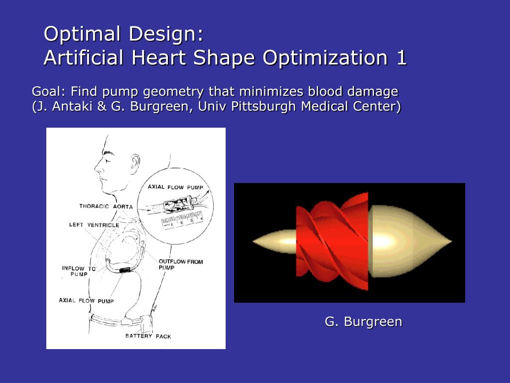 Optimal Design: Artificial Heart Shape Optimization 1 Goal: Find pump geometry that minimizes blood damage (J. Antaki & G. Burgreen, Univ Pittsburgh Medical Center) G. Burgreen