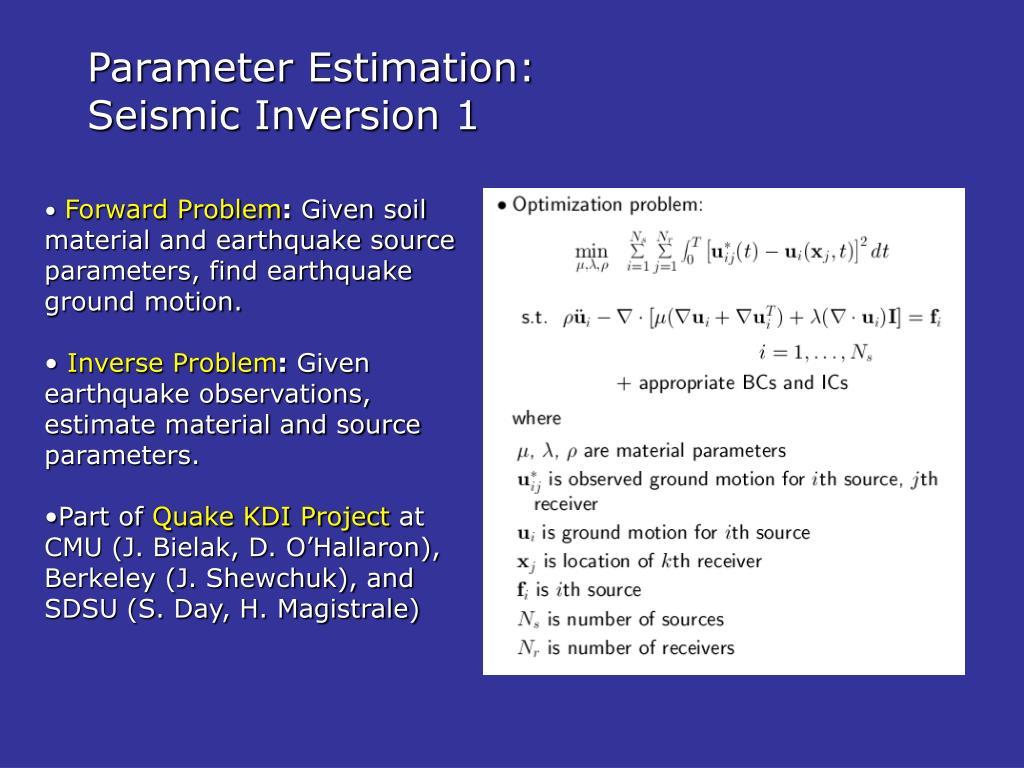 Parameter Estimation: Seismic Inversion 1 • Forward Problem: Given soil material and earthquake source parameters, find earthquake ground motion. • Inverse Problem: Given earthquake observations, estimate material and source parameters. • Part of Quake KDI Project at CMU (J. Bielak, D. O’Hallaron), Berkeley (J. Shewchuk), and SDSU (S. Day, H. Magistrale)